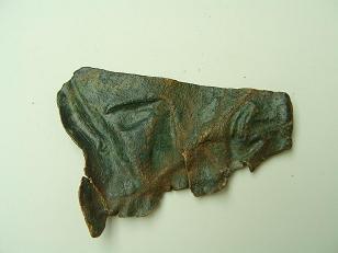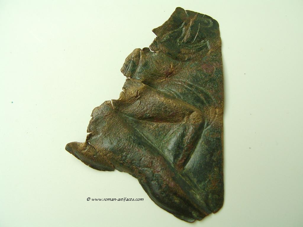 Bronze fragment showing a detailed male leg with muscle definition. There is a hand in the top right near an unknown item. It is unknown if this is a Roman item, once part of a piece of a helmet or possibly part of a Chain mail connector such as this item. Chainmail connector Or if it simply is another ancient item. A soft light green patina covers the piece, with some of the original bronze showing through.
