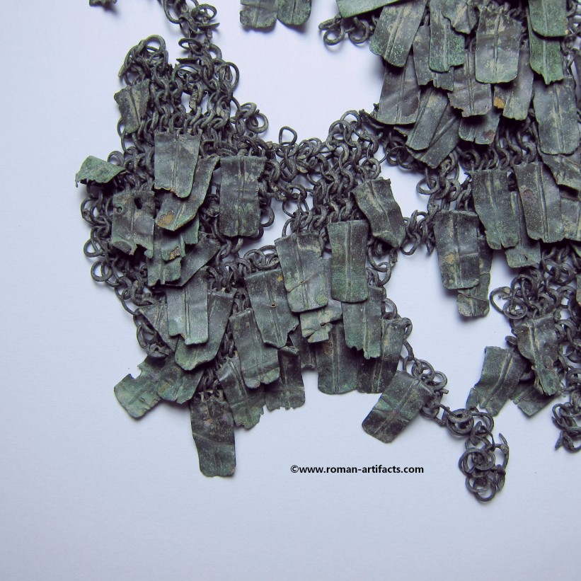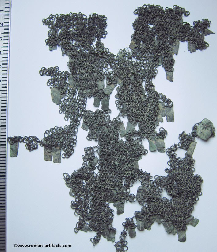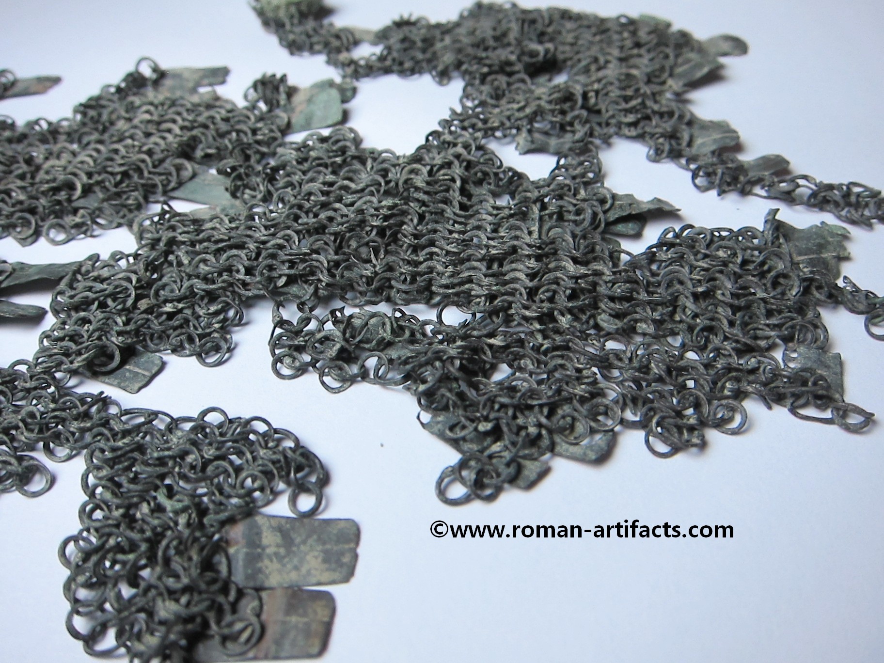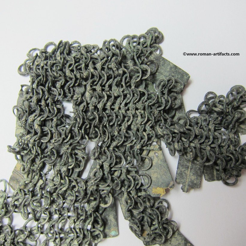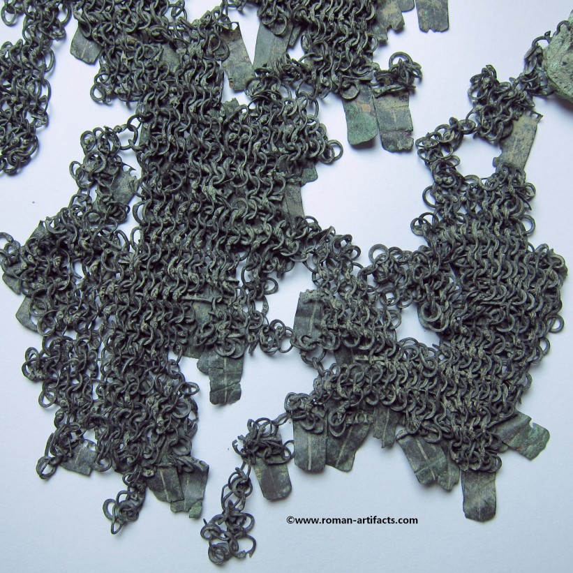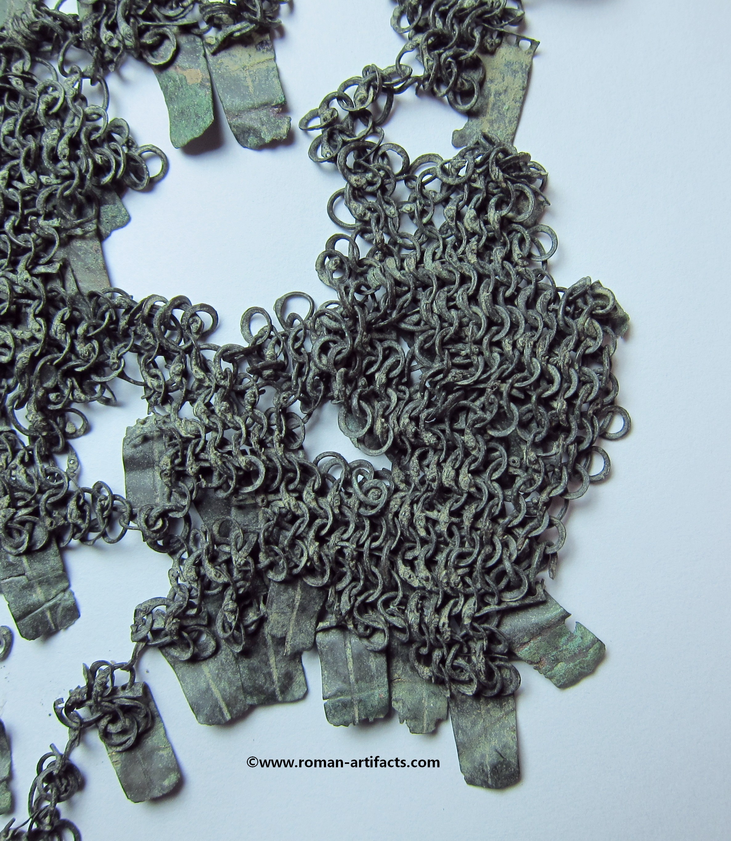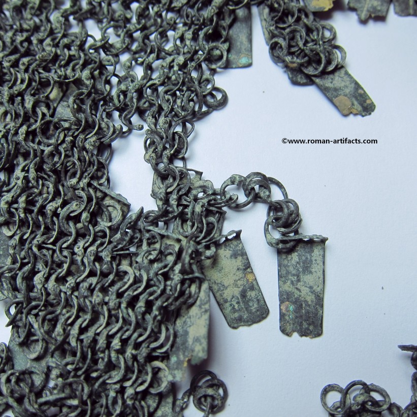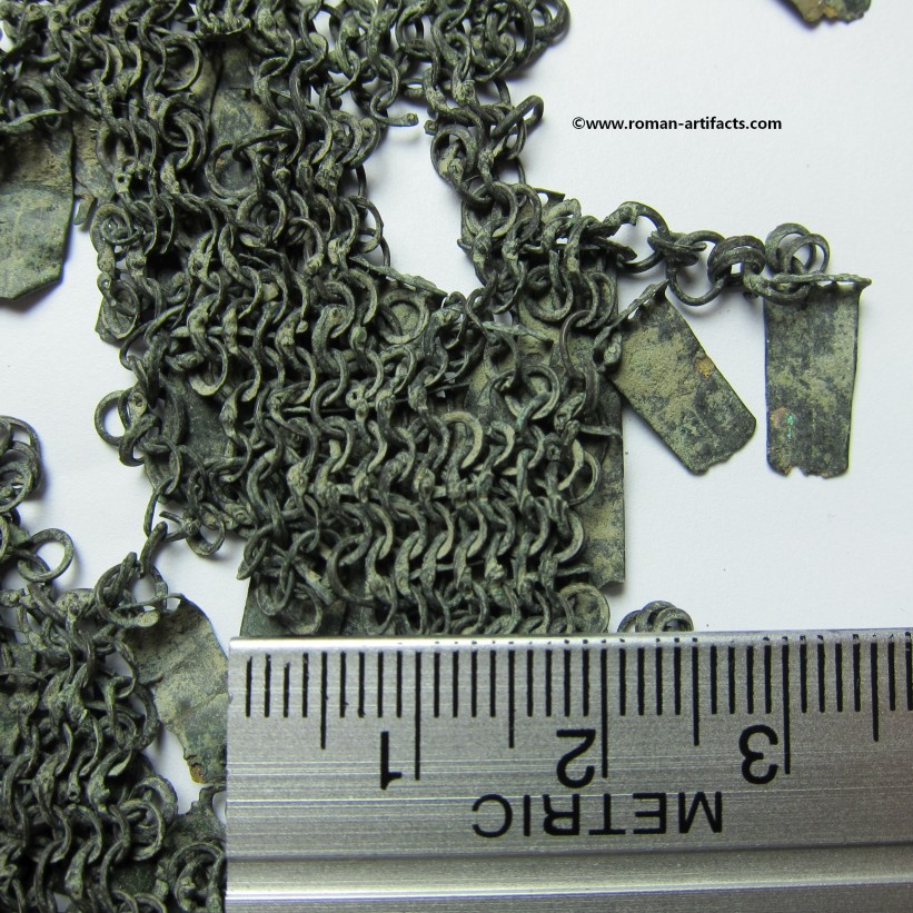 A an etremely rare (one of only 15 other documented examples) of Lorica Hamata Squamataque. A unqiue type of armor only known to be associated to the Romans, which was constructed with small brass rings and attached scales. This armor was essentially a hybrid armour consisting a mail linked armour with interwoven brass scrales. The shear small size the pieces of the armour are themselves astounding. The ringed portion consists of alternating rows or riveted and solid rings. The solid rings are only ~3.5mm wide and the riveted rings are less than 5mm wide. The scales are then attached to each row of riveted rings and the scale attaching point is folded over 90 degrees so the scale lays flat on the rings. The scales themselves are also very small compared to the normal Squamata scales. There is a center ridge on the scales created by hammering the flat scale into a groove through a technique called "coining". This makes the scale stronger and more rigid. The overall armour would have appeared incredibly impressive owing to its small hanging scales and would have flowed and moved incredibly well with the wearer. The small number of known examples also attests to its rarity and likely limited use. A type of armor only reserved to the top elite Roman. Based on reconstruction work by Erik.Schmid it is estimated that nearly 20,000 scales and 160,000 rings were needed to complete the armor. Without taking into account the work and time needed to mine the ore, make the wire, punch the solid ring and make the scales, it is estimated that it would take 1 person nearly 500 days to complete the garment. Such labor and time would certainly have contributed to the extreme rarity of the armour. When ever the armour is discussed there are questions raised on whether it would have been effective in battle. Without testing accurate reconstructed examples it is hard to make concrete opinions on that question. It can however be noted that the armour was clearly designed with strengthening additions (such as the hardened centra rib on the scales). The overlaping and "community" effect of the scales, and mail backing also make the armour appear stronger than the individual sizes would warrant. As is noted by Matijn Wijinhoven, the many overlaping scales (3) actually make the scale section alone .75-.9mm thick. The combined thickness of the armour with the mail backing is approximately 4mm. These thicknesses are comparable (if not better) than other Roman armour examples.(1)(2) Drawing example of how the rings would have looked (from Martijn Wijnhoven)
