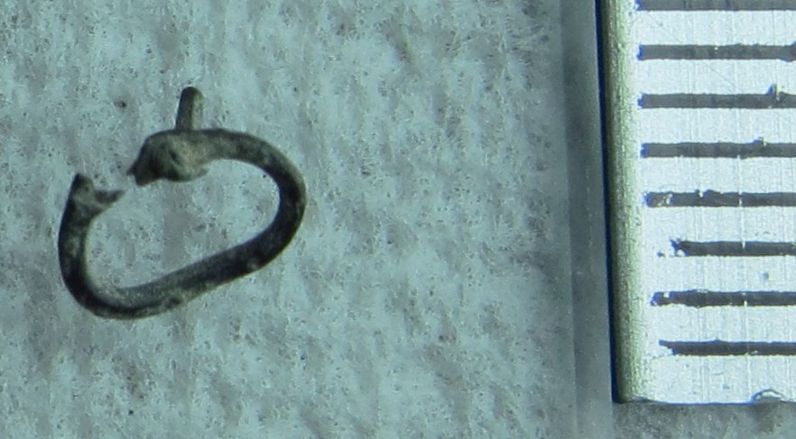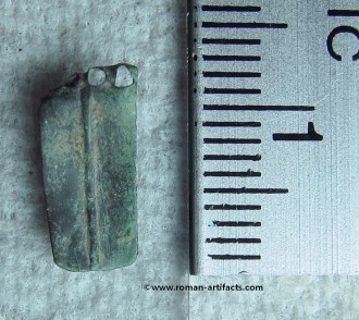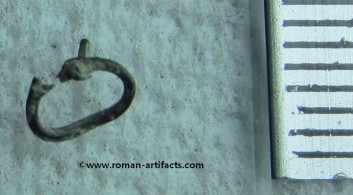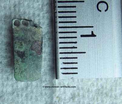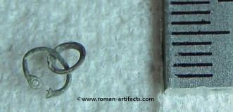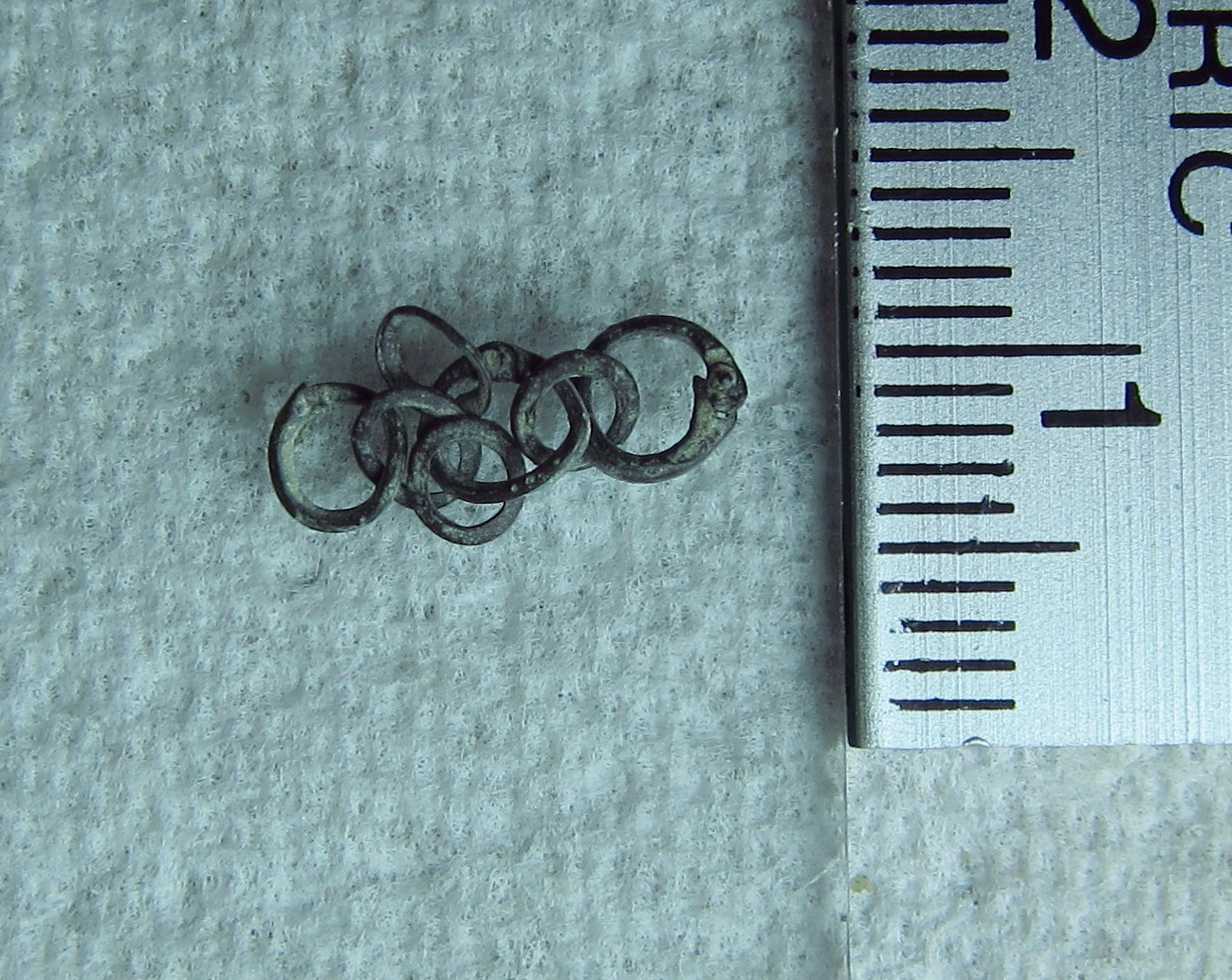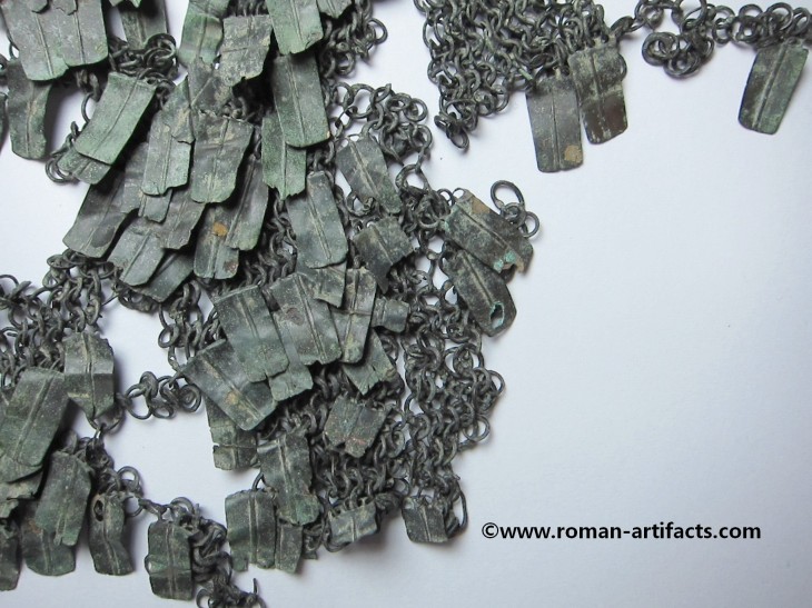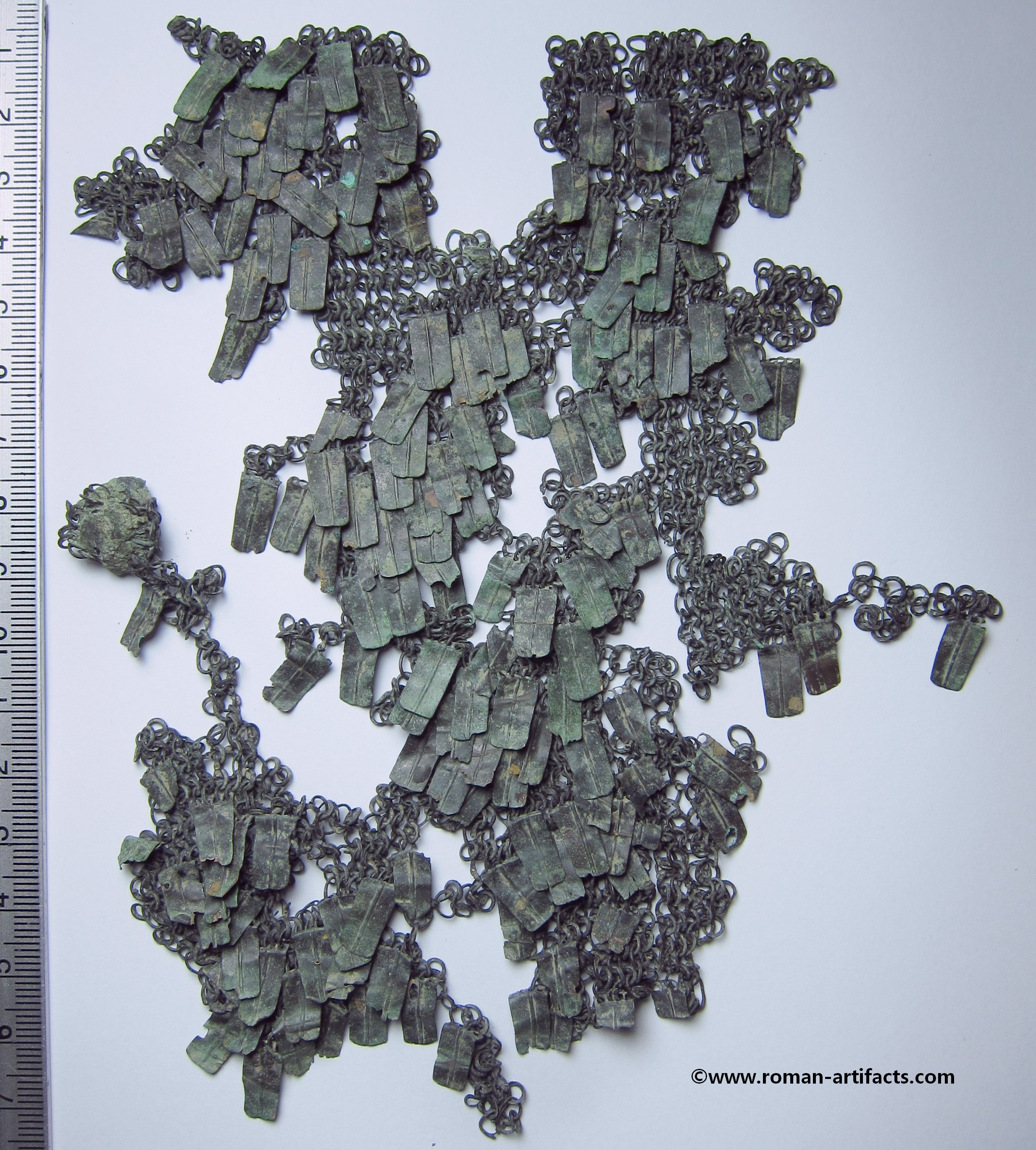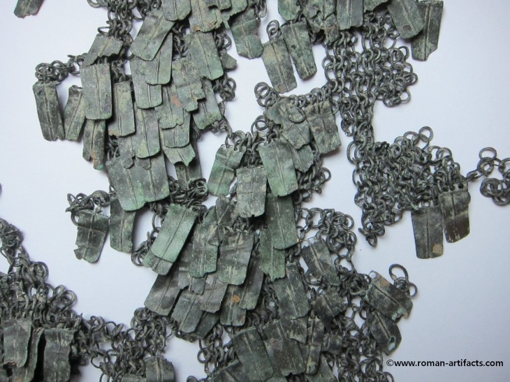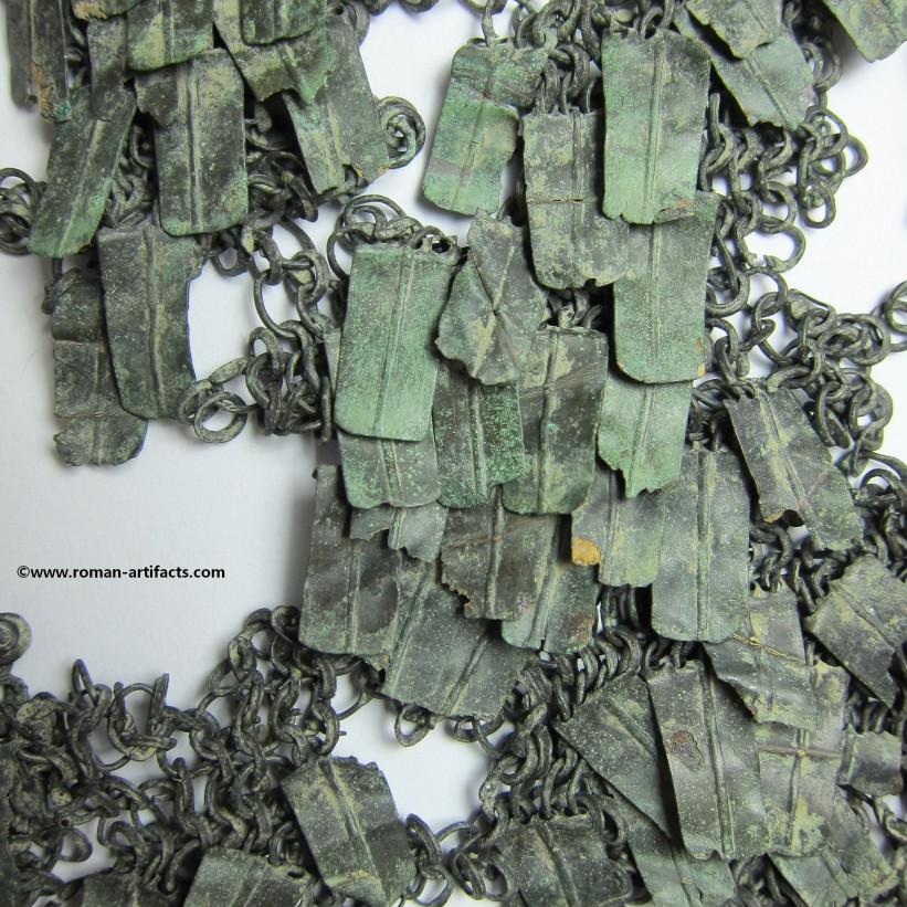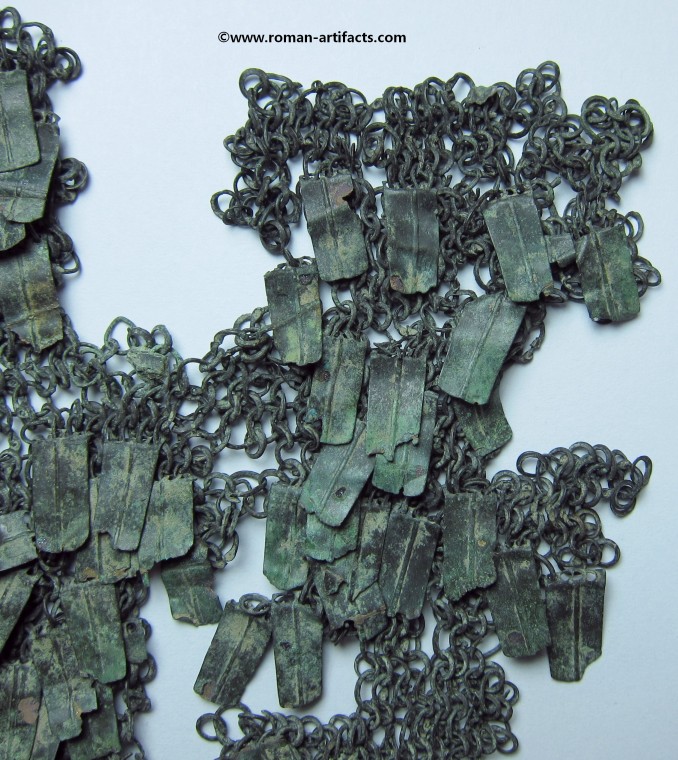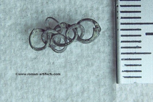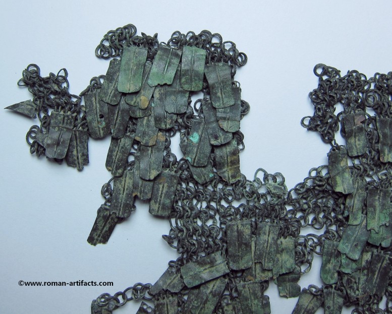 A an etremely rare (one of only 15 other documented examples) of Lorica Hamata Squamataque. A unqiue type of armor only known to be associated to the Romans, which was constructed with small brass rings and attached scales. This armor was essentially a hybrid armour consisting a mail linked armour with interwoven brass scrales. The shear small size the pieces of the armour are themselves astounding. The ringed portion consists of alternating rows or riveted and solid rings. The solid rings are only ~3.5mm wide and the riveted rings are less than 5mm wide. The scales are then attached to each row of riveted rings and the scale attaching point is folded over 90 degrees so the scale lays flat on the rings. The scales themselves are also very small compared to the normal Squamata scales. There is a center ridge on the scales created by hammering the flat scale into a groove through a technique called "coining". This makes the scale stronger and more rigid. The overall armour would have appeared incredibly impressive owing to its small hanging scales and would have flowed and moved incredibly well with the wearer. The small number of known examples also attests to its rarity and likely limited use. A type of armor only reserved to the top elite Roman. Based on reconstruction work by Erik.Schmid it is estimated that nearly 20,000 scales and 160,000 rings were needed to complete the armor. Without taking into account the work and time needed to mine the ore, make the wire, punch the solid ring and make the scales, it is estimated that it would take 1 person nearly 500 days to complete the garment. Such labor and time would certainly have contributed to the extreme rarity of the armour. When ever the armour is discussed there are questions raised on whether it would have been effective in battle. Without testing accurate reconstructed examples it is hard to make concrete opinions on that question. It can however be noted that the armour was clearly designed with strengthening additions (such as the hardened centra rib on the scales). The overlaping and "community" effect of the scales, and mail backing also make the armour appear stronger than the individual sizes would warrant. As is noted by Matijn Wijinhoven, the many overlaping scales (3) actually make the scale section alone .75-.9mm thick. The combined thickness of the armour with the mail backing is approximately 4mm. These thicknesses are comparable (if not better) than other Roman armour examples.(1)(2) Drawing example of how the rings would have looked (from Martijn Wijnhoven)