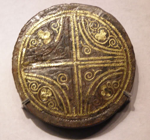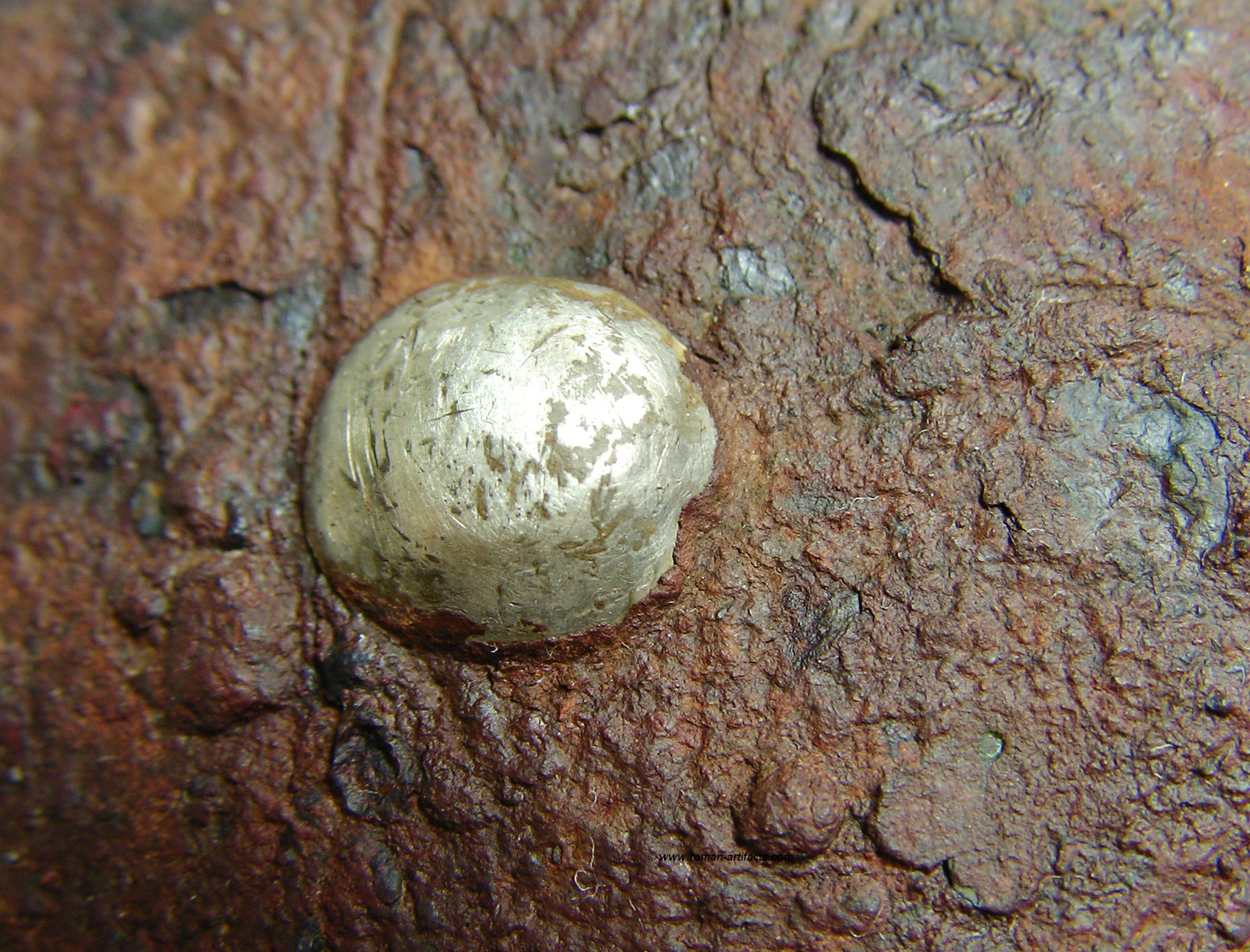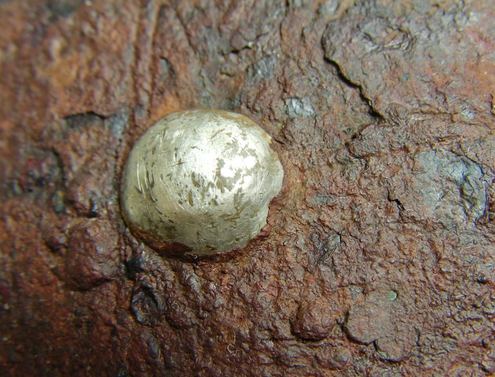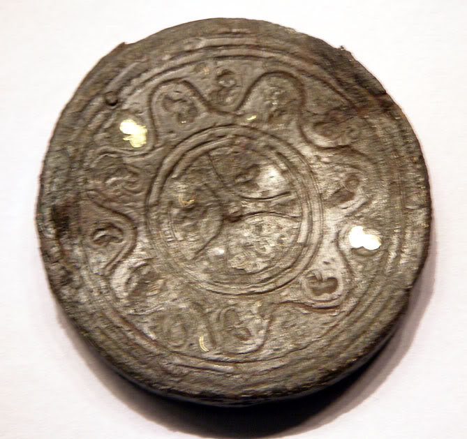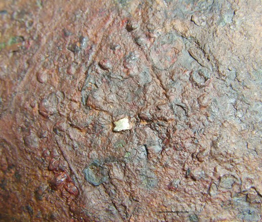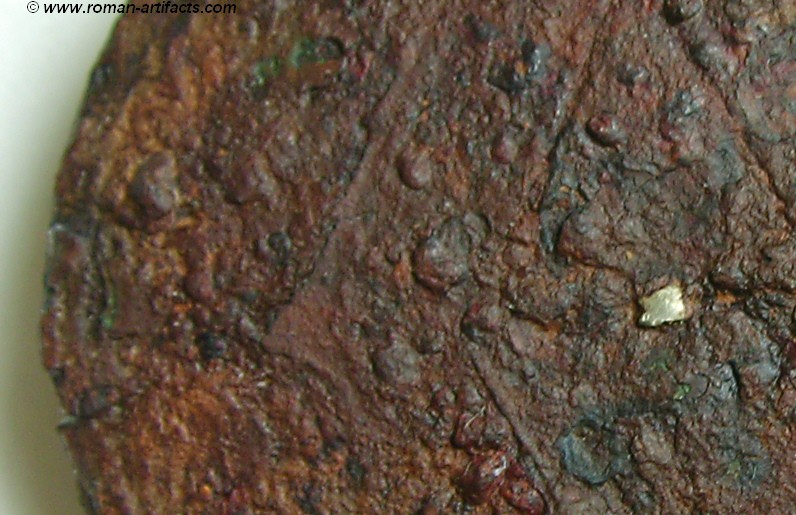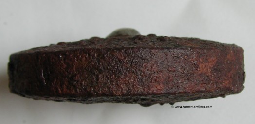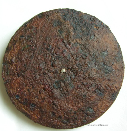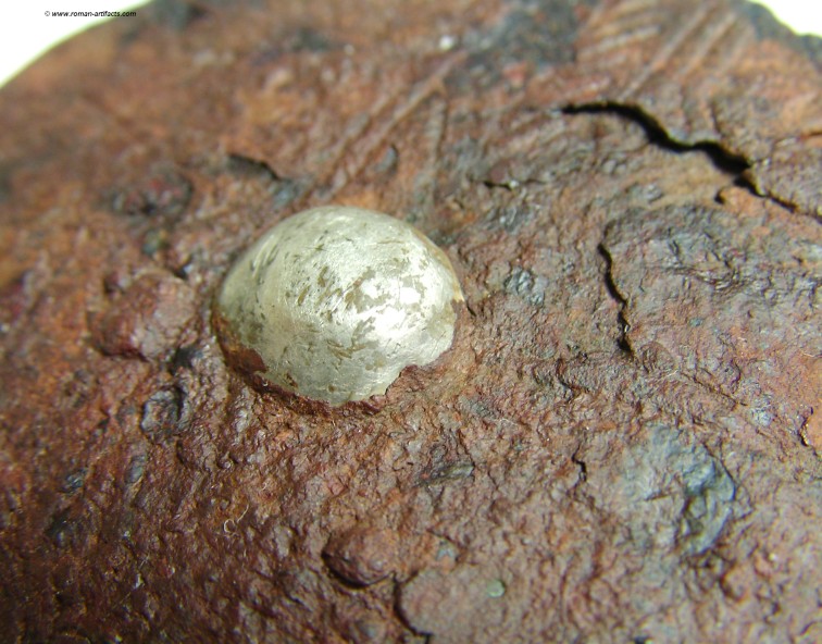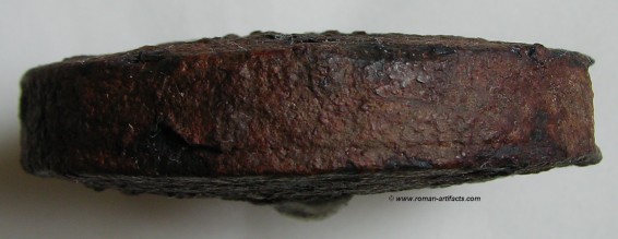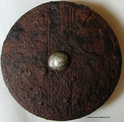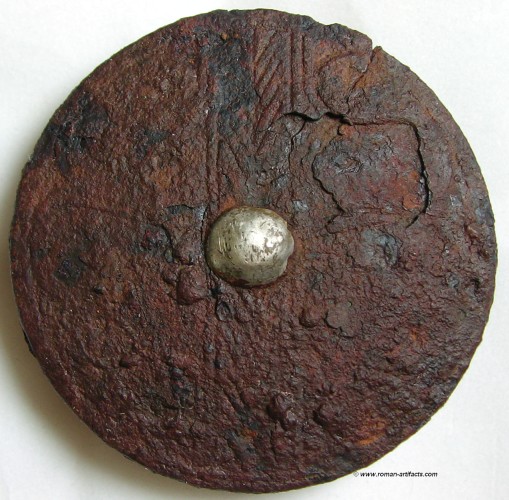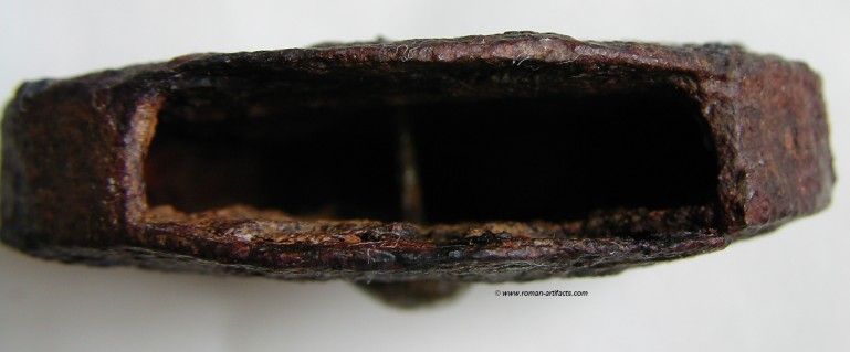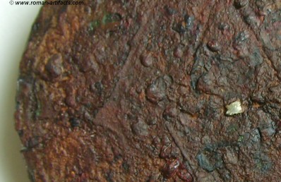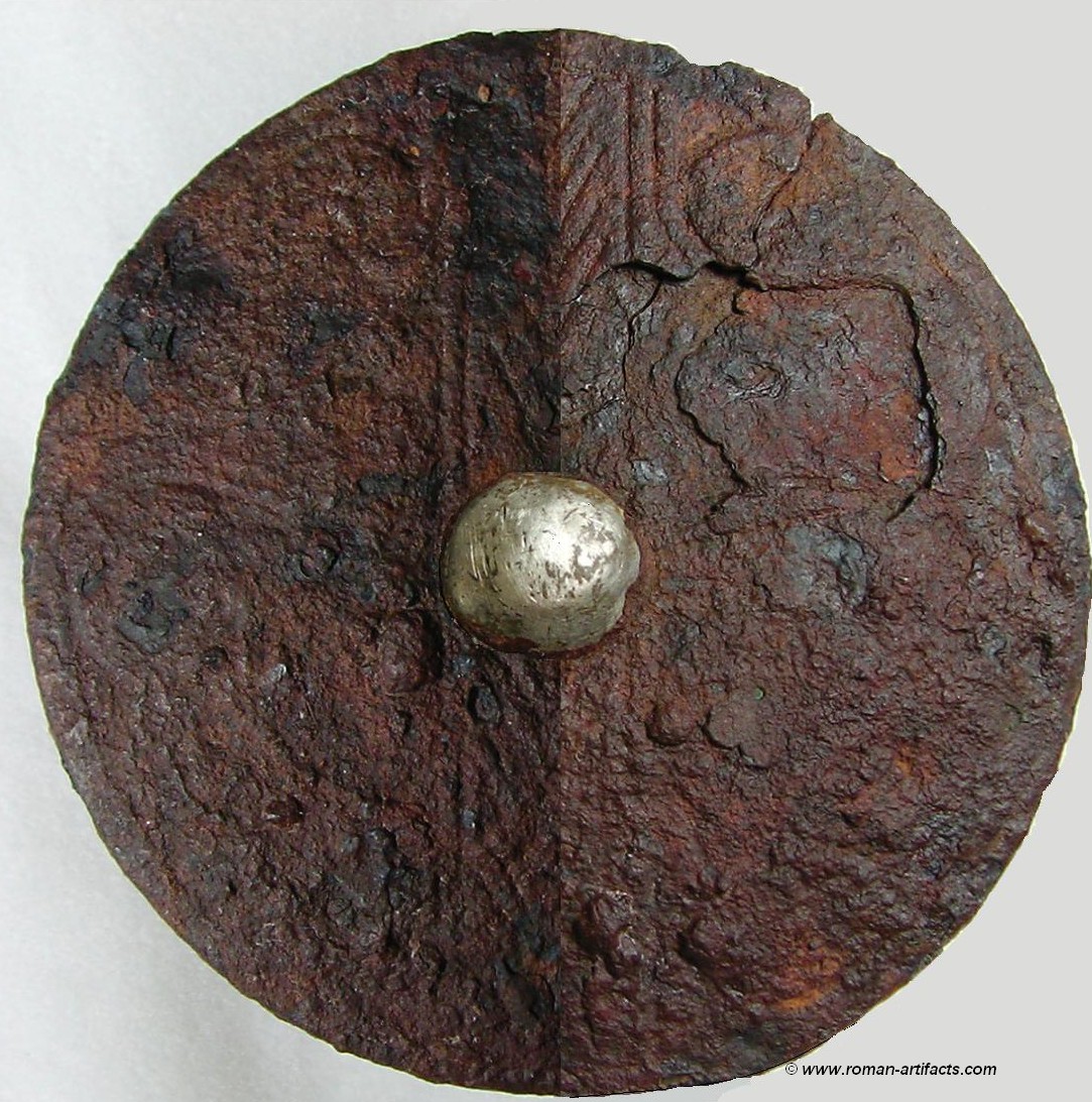 Displayed is a rounded Sword Chape for the Longer Spatha or shorter semi-spatha short sword. Basically the end attachment clamping the wooden pieces of the scabbard together at the point of the scabbard as well as providing a popular style to the military sword of the time. These chapes commonly were decorated with silver gold or possibly bronze inlay's and patterns. This item has a clear pattern engraved in the corroded iron consisting of a center double line edged feather or angled line patter. There also appears to be a slightly angled pattern protruding out at right angled to the center line. Also in the top corners are two semi-circular patterns. It is unknown what kind of inlay this piece had, however judging by the solid silver center rivet (the exit point can be see on the reverse), it would likely have been inlaid with gold. However what is noticeable are small areas, specifically on the reverse where green shows through. This is possibly the tell tail sign of bronze/copper which has since corroded away, with what little had remained. (see close up below). What the piece also has is a diamond shaped concentric pattern on the reverse, as is noticeble in the close up image above and the over photo to the left. Some type of border also appears to be visible, much like examples noted later on. The difference in this chape compared to the earlier pointed variety are really a function of style than any technological development. It is believed that as the Roman army changed and incorporated more cultures it also adapted different styles and types of weapons into its ranks. In the 3rd Century the Gladius was phased out and a long wider Spatha was introduced to to the Roman army. Along with this came a difference in how the sword was worn on the belt (now attached through a belt over the shoulder called a baldric). A variety of chapes were around during this period, the only consistent thread was that the pointed triangular type was no longer around. Some were rounder and larger than this example and others were rectangular. (1)(2)(3) Similar Examples, sketches and originals from museums