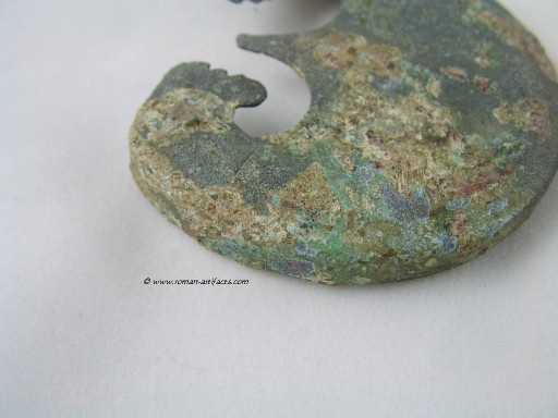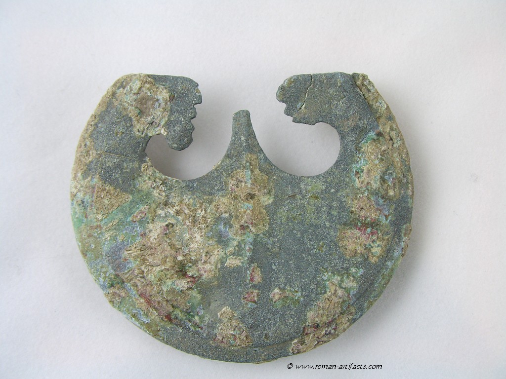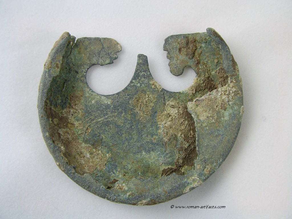 Round shaped Sword Chape for the Longer Spatha or shorter semi-spatha short sword. The end attachment clamping the wooden pieces of the scabbard together at the end point of the scabbard. Two crescent shaped openings exist near the top, with a raised central peak. A line/ridge runs down the center. Completely intact piece with the original wet environment green patina. The chape widens at the top, much like an wedge does when viewed from the side (see the side view photo). (2) In the 3rd Century the Gladius was phased out and a long wider Spatha was introduced to to the Roman army. Along with this came a difference in how the sword was worn on the belt (now attached through a belt over the shoulder called a baldric). A variety of chapes were around during this period, the only consistent thread was that the pointed earlier type was phased out. The sheaths no long had large elaborate decorations on them as earlier ones had. Some of the chapes were larger than this example (See Round Spatha Chape) and others were even rectangular. (1)(2)(3)