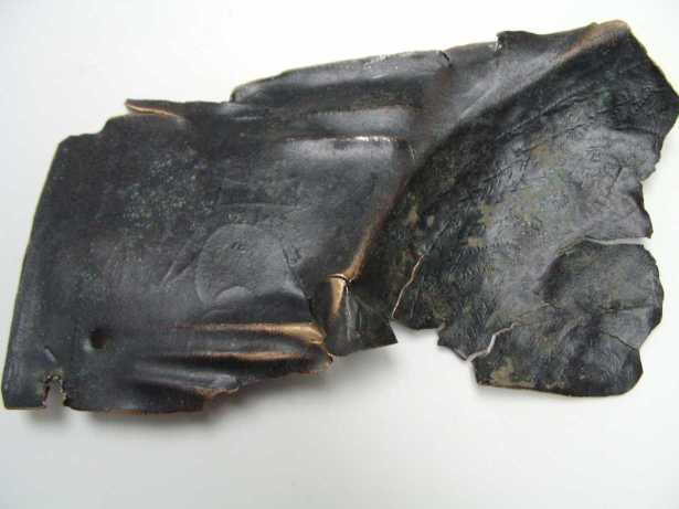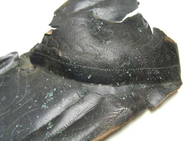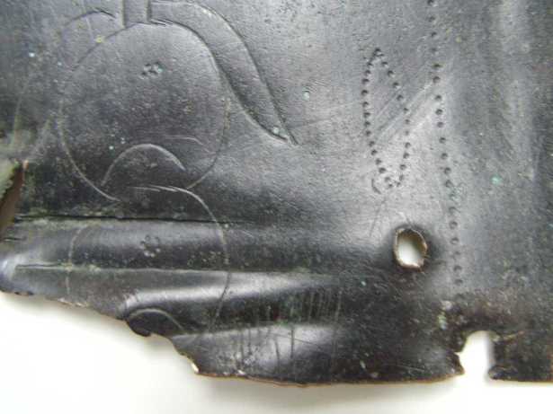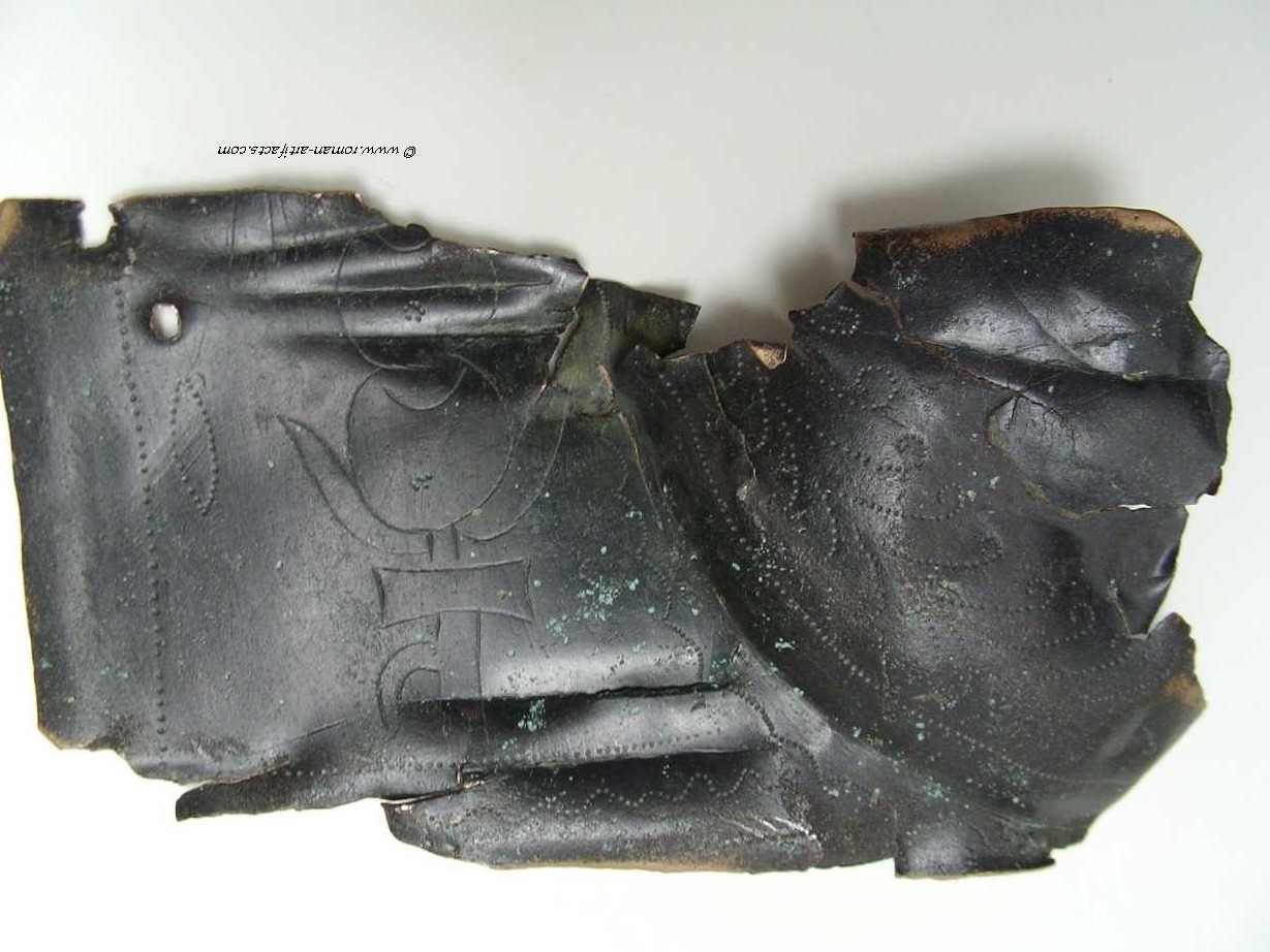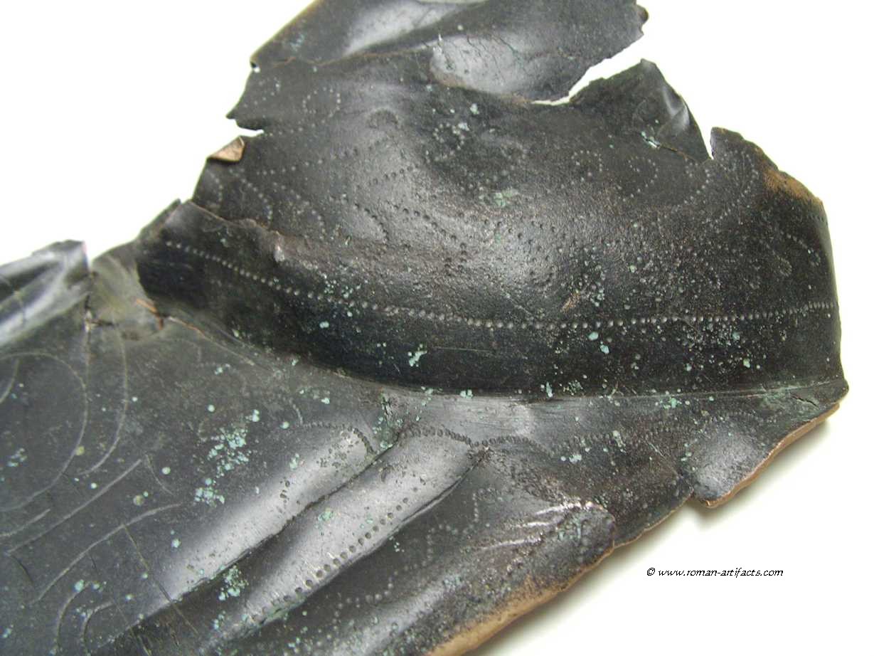 A fragment of a Bronze shield boss/umbo, from a rectangular Roman Scutum (shield). There are remnants of the ornate "punched" design that it once had. A repetitive floral pattern surrounds the raised portion, followed by a dot pattern border.
