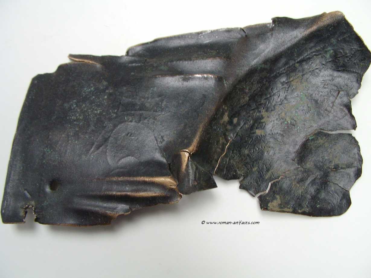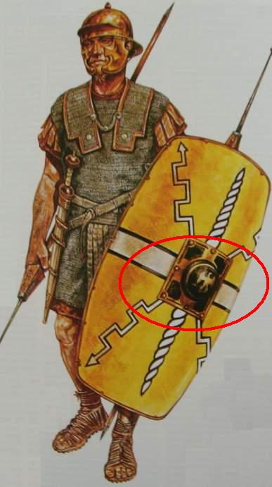 The top part has a wavy line pattern as well as a straight border. A vertical oval shape is to the right of the standard and is unidentified however may stand for good luck. A similar symbol appears on the large example in the museum photo (to photo left). One of the rivet holes still remains and shows how this would have been mounted on its shield. There are Five "gashes" in the bronze item all parallel running horizontally, above and below the standard. This is perhaps evidence of battle damage or some other unknown means. The Patina does appear to cover this piece, including the "gashes" so that indicates they are from ancient times (perhaps when the fragment was going to be recycled as scrap). The Patina is a dark green color and small brighter pitted green spots are visible up close. The reverse still has remnants of some dirt and/or dust. The item has however obviously been cleaned to a level that does reveal some of the original bronze. This is unfortunate, however was the common practice and teaching (refer to any shiny Roman helmet in the British Museum). These bronze items were commonly personalized to represent the individual soldier and his legion, using a simple pointed tool (similar to the Eagle artifact with the Soldiers name on it). The similar and more complete example in the attached photo shows one that was further engraved with the legions name. The Roman shield was very important and was often used as an offensive weapon to strike the enemy. (hence the forward hand grip as opposed to the should/forearm more commonly know). **Updated Note** Upon closer examination the thickness of the actual fragment does shed some considerable doubt on the use of the shield as a weapon. The thickness of the piece is only 0.35-0.4mm as it was "dished" out during production (Clear repeated hammer marks are visible on the items reverse). The "dishing" process requires the item to be repeatedly hammered to extend the metal outwards (producing the dish shape). The end result however is a thinner metal, when compared to the surrounding area. The thickness of this dished out area does not appear to be strong enough to be used to "punch" the enemy as some suggest. (1)(2)(3) -painting by John Warry Click on Pictures for higher resolution