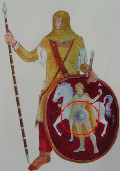 would have attached to the front of a flat Oval or Hexagonal shield used