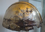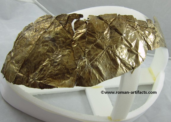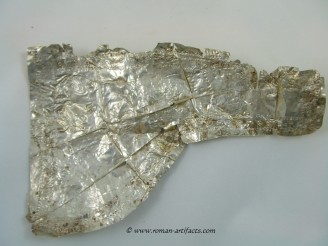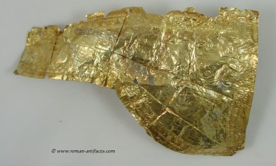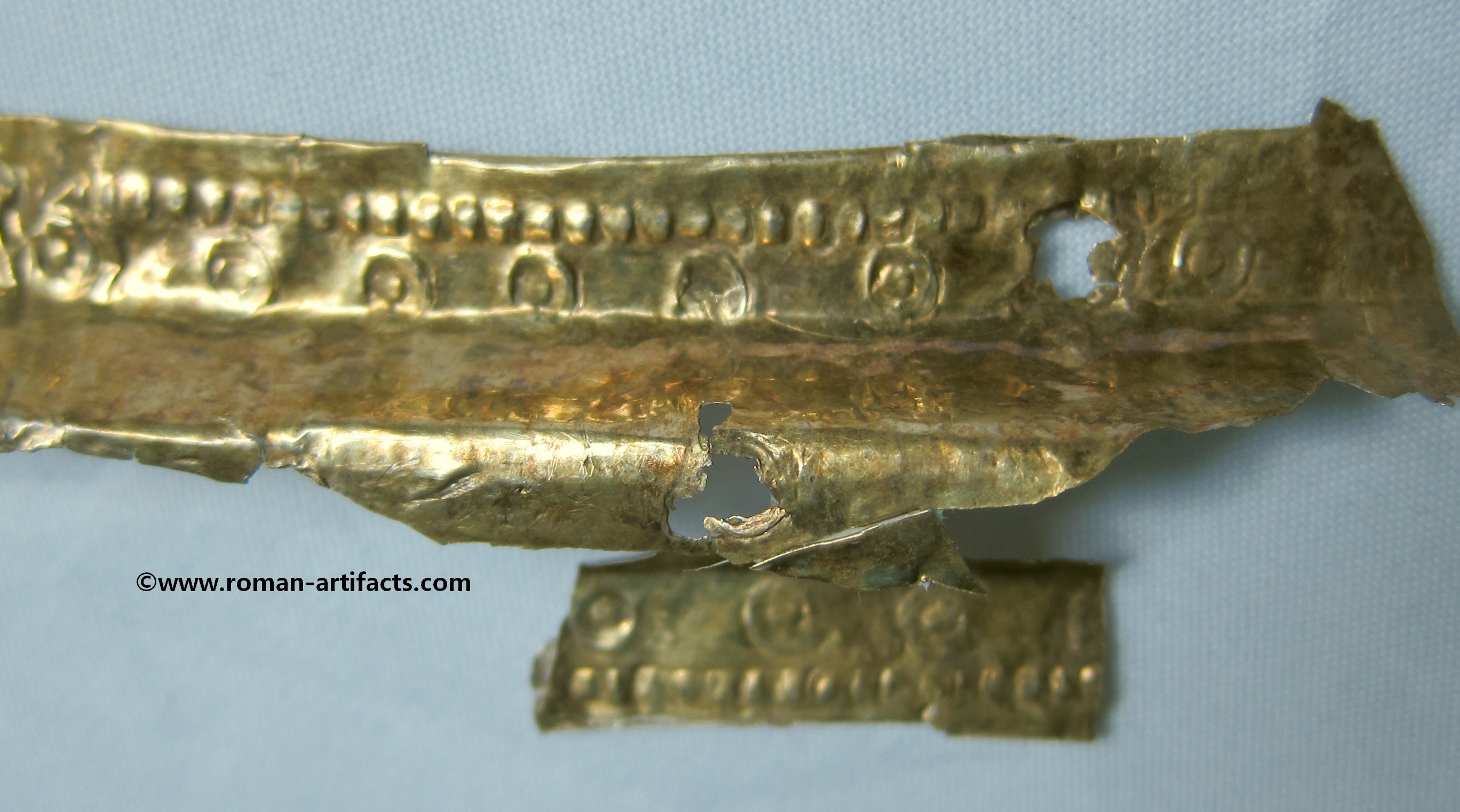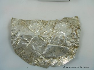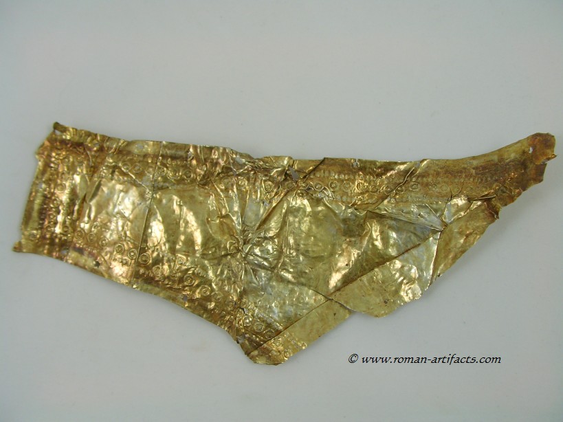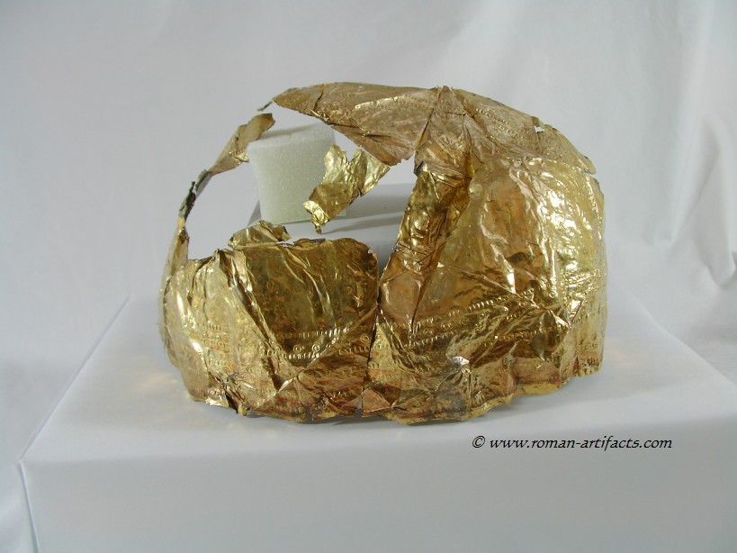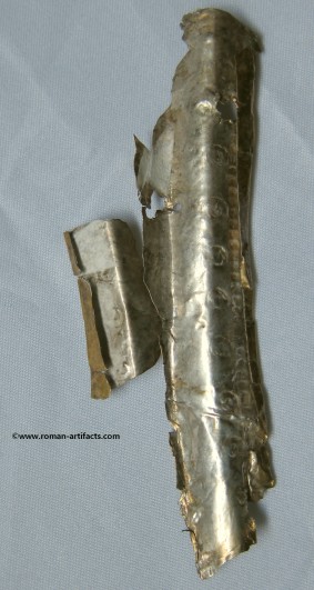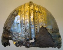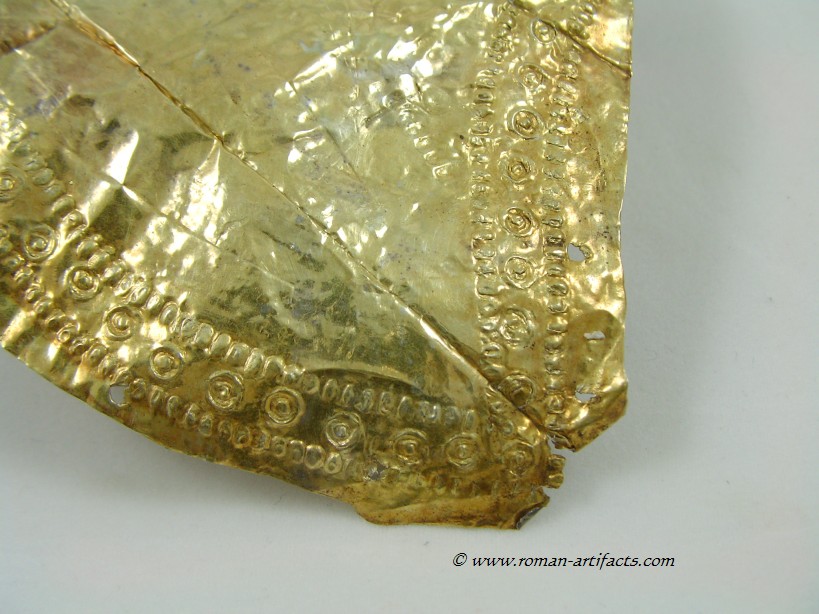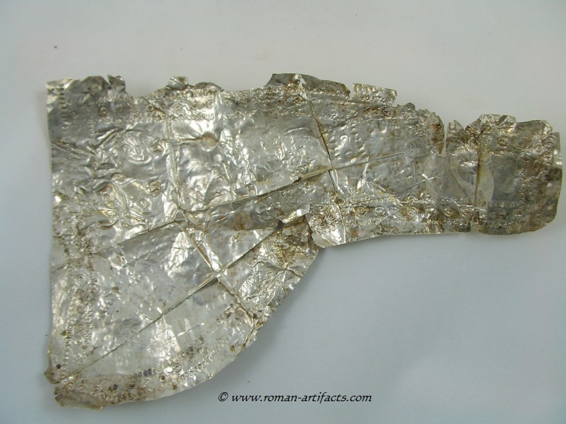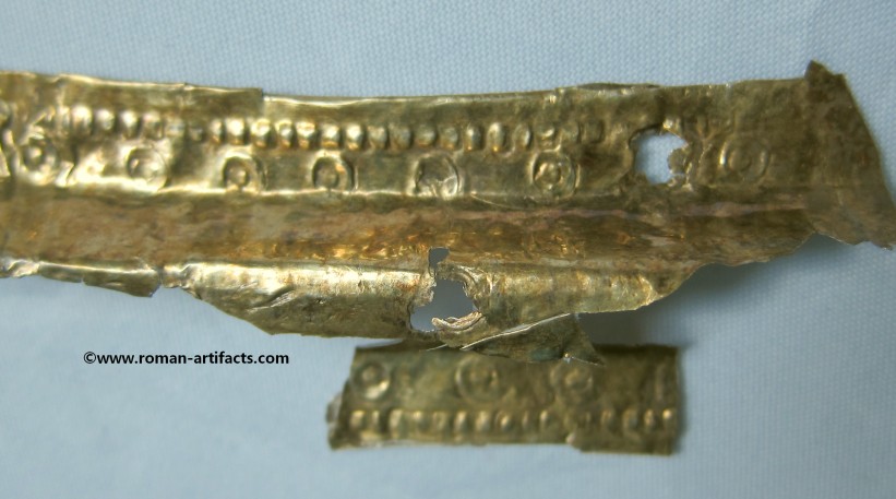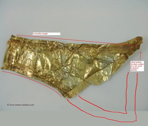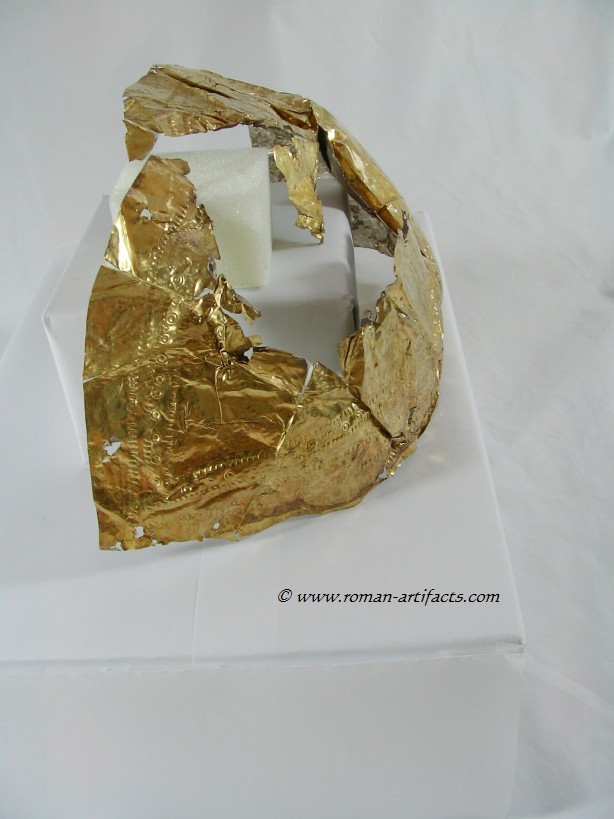 INTRODUCTION: The fragmented collection of silver sheets, which are gold plated, were at one time covering at least 2 or 3 different late Roman helmets. The main fragments as measured out above were clearly the decorative portion of a Duerne-Berkasovo Variant II type helmet. The common term for these late Roman helmets is "Ridge Helmets". These ridge helmets consisted of two or more segments that were riveted together to form the complete helmet. In this case these fragments clearly come from two original halves and were riveted together around the top. A decorative "Ridge" portion re-enforced this riveted top portion, giving the helmet its name. (3)(4)(5) Different variants exist, some consisting of as many 6 sections, which were all riveted together. Only the more elaborate helmets were covered in a gold covering, and would have likely been reserved for the emperor or highest field commanders. A covering that was made out of the less precious metal, silver, but gold plated was more common (some of the known helmets have some traces of the silver sheeting at the rivet points), however also likely could have been reserved for field commanders or individuals of higher rank or status. Many of the Intercia helmet (see below) also just had decorated Iron designs, clearly not meant to hold a silver sheeting cover. Some highly decorated examples:
