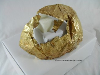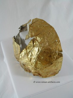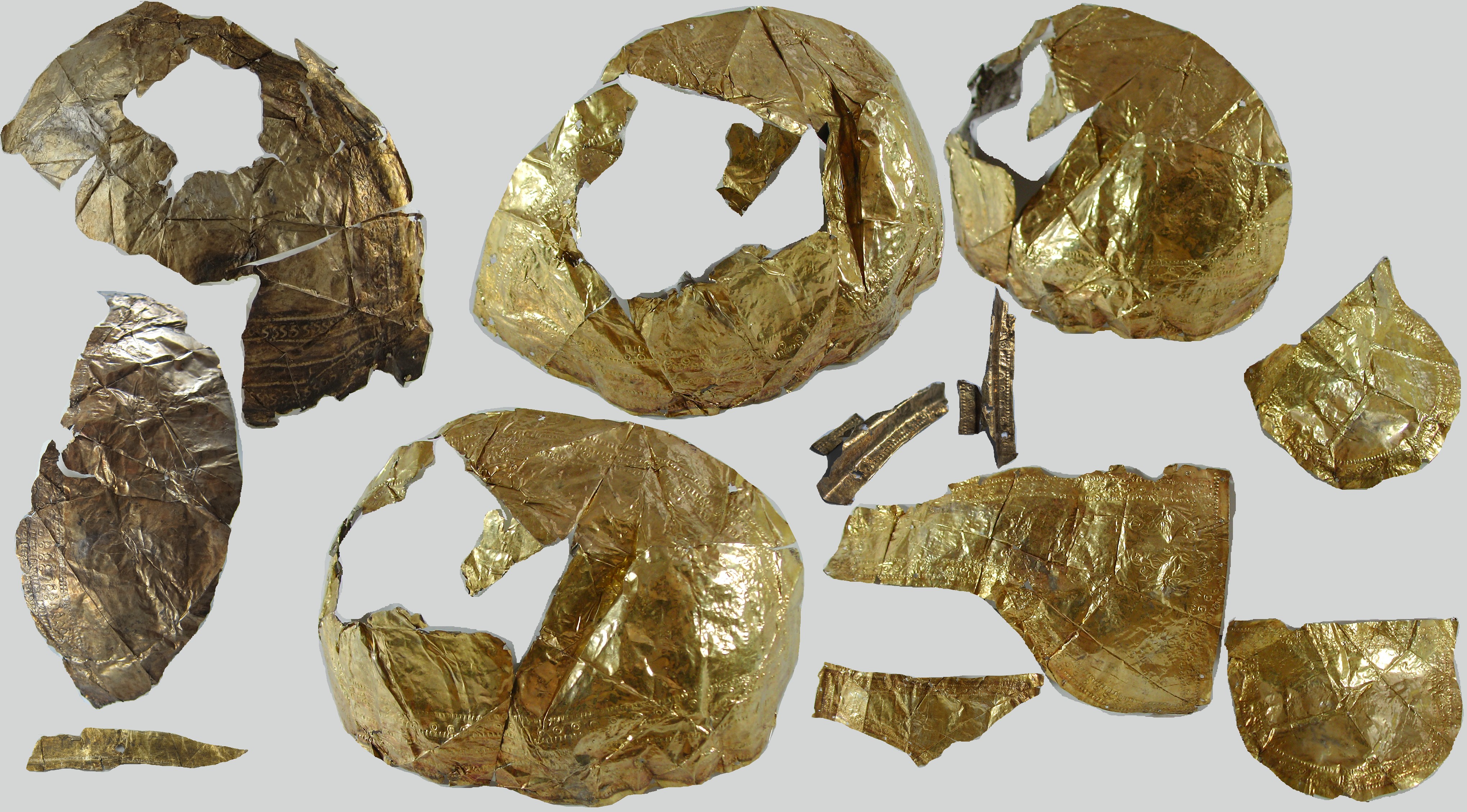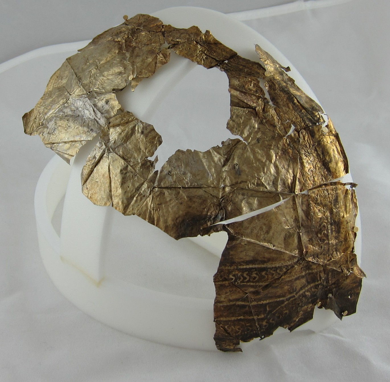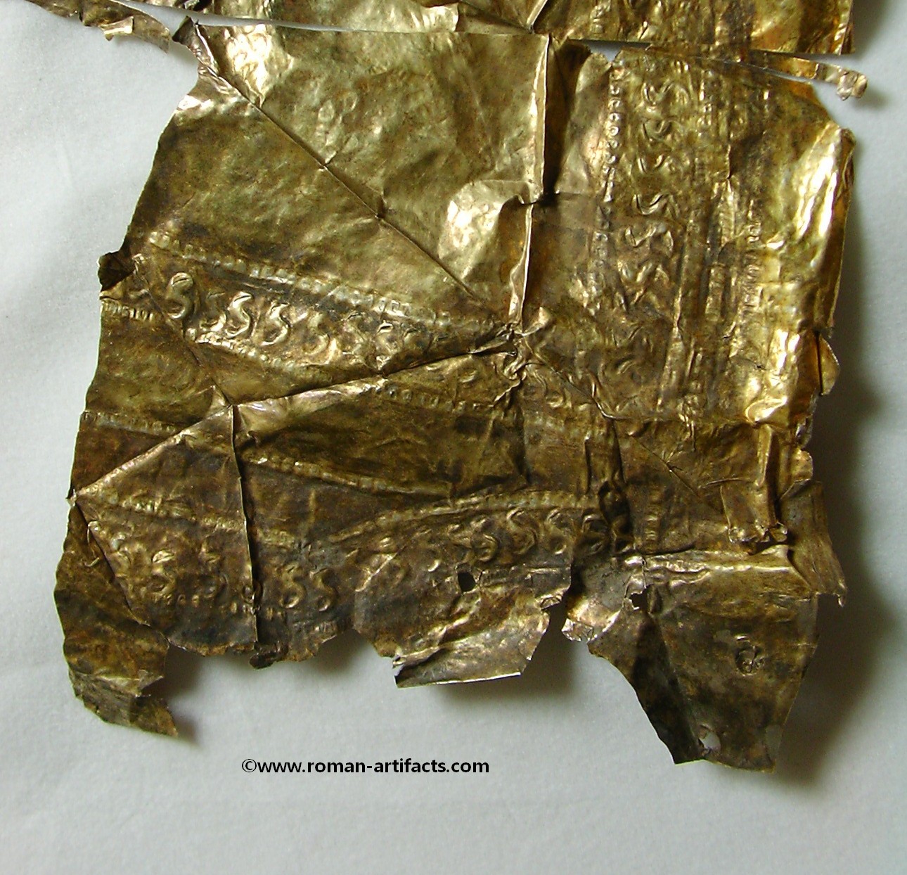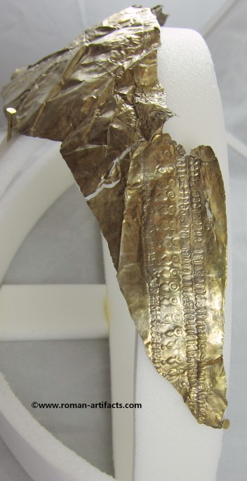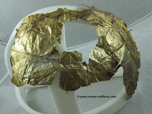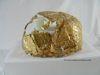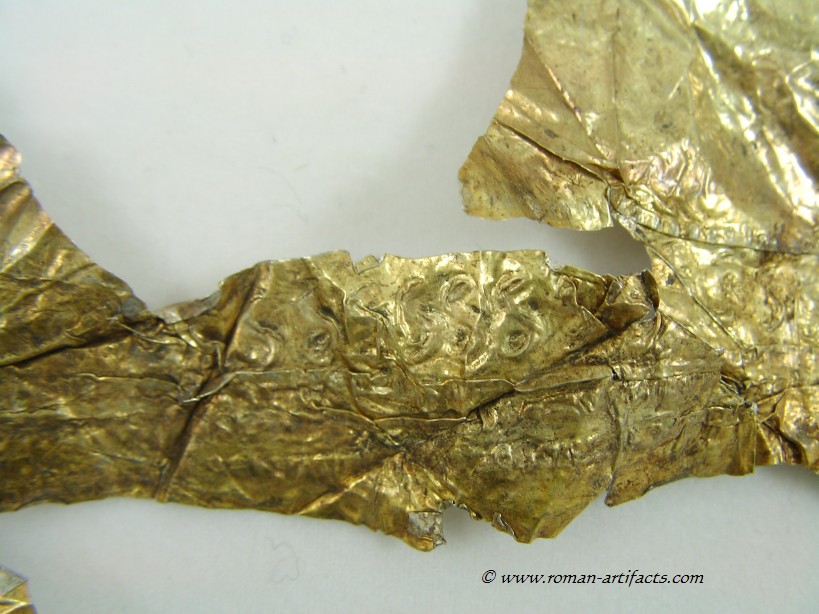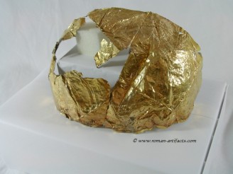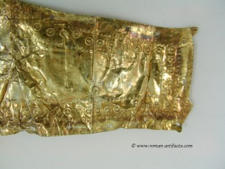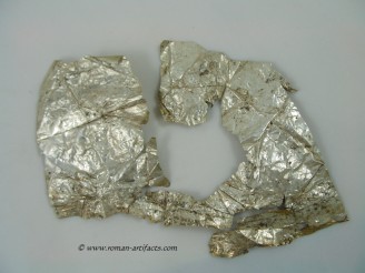 INTRODUCTION: The fragmented collection of silver sheets, which are gold plated, were at one time covering at least 2 or 3 different late Roman helmets. The main fragments as measured out above were clearly the decorative portion of a Duerne-Berkasovo Variant II type helmet. The common term for these late Roman helmets is "Ridge Helmets". These ridge helmets consisted of two or more segments that were riveted together to form the complete helmet. In this case these fragments clearly come from two original halves and were riveted together around the top. A decorative "Ridge" portion re-enforced this riveted top portion, giving the helmet its name. (3)(4)(5) Different variants exist, some consisting of as many 6 sections, which were all riveted together. Only the more elaborate helmets were covered in a gold covering, and would have likely been reserved for the emperor or highest field commanders. A covering that was made out of the less precious metal, silver, but gold plated was more common (some of the known helmets have some traces of the silver sheeting at the rivet points), however also likely could have been reserved for field commanders or individuals of higher rank or status. Many of the Intercia helmet (see below) also just had decorated Iron designs, clearly not meant to hold a silver sheeting cover. Some highly decorated examples: