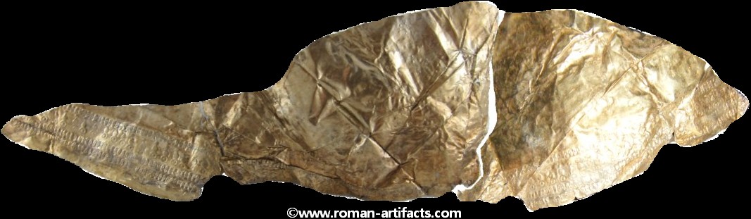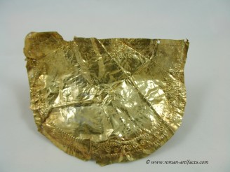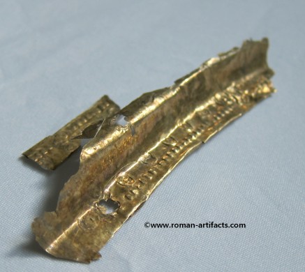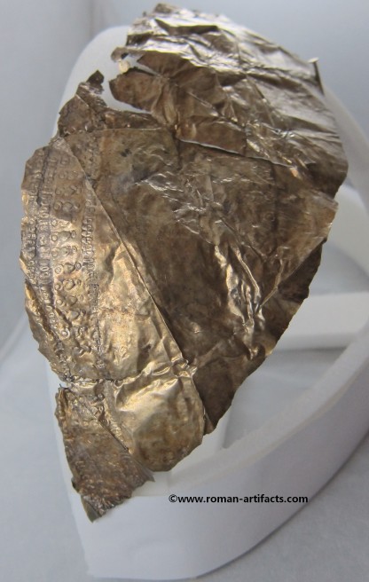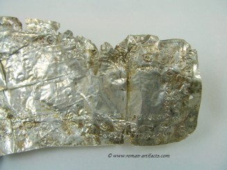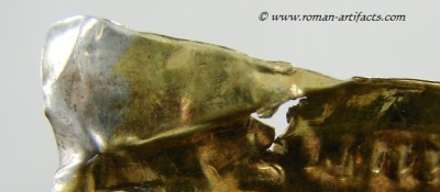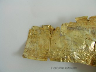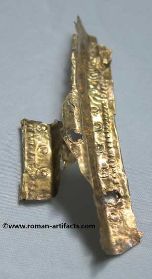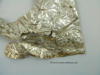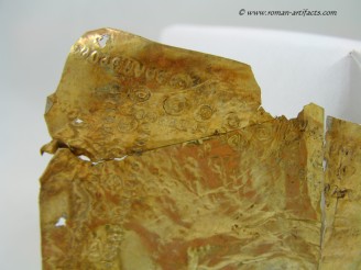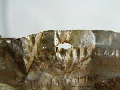 The fragment may also be a portion of the ridge section of another helmet with the large rivet hole being one of the mounting points. The folded over area would be along the ridge piece edge. This location for this fragment is more plausible than the ridge section as it is shaped in a more straight fashion and is not curved like a nasal eyebrow section. Second Cheek Piece: There also exists a second cheek piece, nearly a complete copy of the whole cheek piece which is part of the main set above. This piece however clearly came from the same side of the helmet, thus confirming that it is from a second similar helmet. Unfortunately the front portion is not present, but the shape can be guessed based on the other complete cheek piece. The pattern on this piece is nearly identical to the complete example. Ridge Section There are also two sections remaining of the rdige section from the main helmet. This section is fragmentary, but clearly shows dot pattern and edging pattern running along the base of the ridge. There is also a clear area visible where the ridge portion folded over revealing a bit of the silver underlayer which had either rubbed off from contact or was never properly gilded. The top portion of the ridge that remains also has a large rivet hole left which showed that this example likely had decorative bulbed rivets along the top of the ridge edge for decoration. CONCLUSION: These fragments from at least 3 late Roman helmets constitute a substantial find, which is rarely seen. Only one other such set of helmet coverings is known, as referenced in KOCSIS (1). Those fragments were even less complete, yet included as noted above the nasal section, and also other pieces for at least 2 helmets. Those fragments were also discovered folded up and hidden at a fort wall, likely the result of similar circumstances as these fragments. Further research will be conducted in regards to the last part of the inscription, and the possible reconstruction of what the helmet may have looked like complete. If you have anything further that you can add to this topic, or these specific fragments, please do not hesitate to contact me. The following references will act as supplementary reading for anyone interested.(1)(2)(3)(4)(5)(6) |