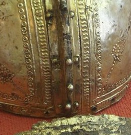The following image speaks to the gilded surface, as the original maker missing a small corner of the silver sheet. This shows similarities to the gilded surface of the Berkasovo Helmet. On one of the cheek pieces the silver section is clearly visible, having been missed by the original maker during the gilding process.
