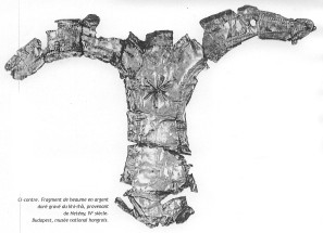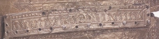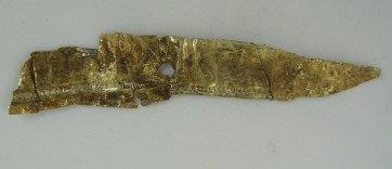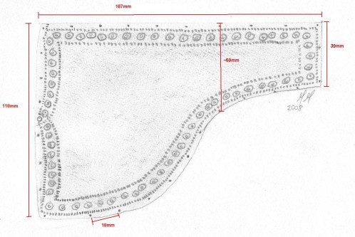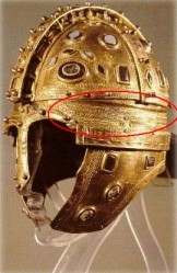 Possible source of this fragment? It is possible that this fragment is actually part of the nasal covering of a Ridge Helmet. The fragment has a large rivet hole (which a nasal section had many of), and has a curved shape which is consistent with the eye brow section of the nasal covering. The narrow folded over edge of the silver sheet, along the lined border would also be consistent with this hypothesis. The follow is a picture of this fragment, when compared to the complete silver gilded Nasal cover from Heteny.
