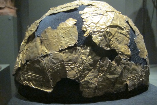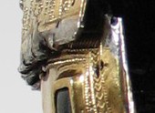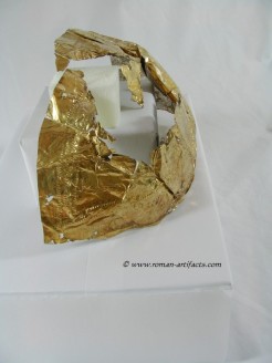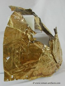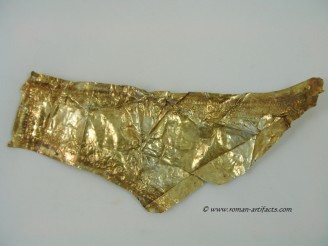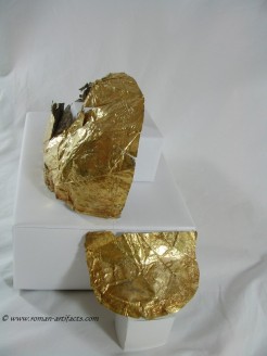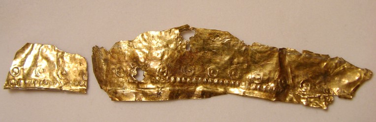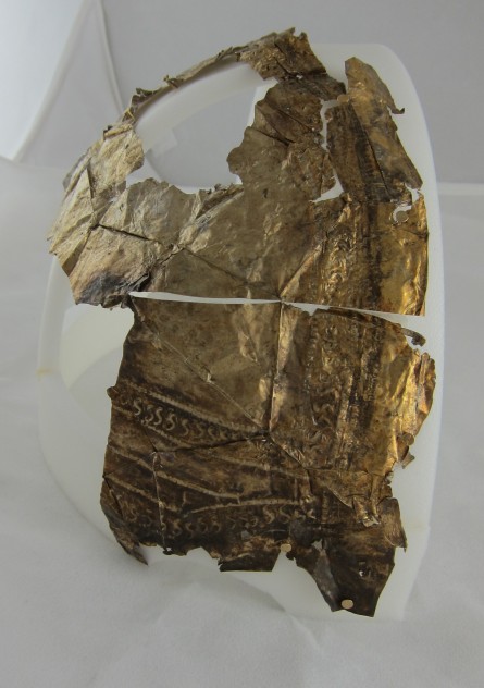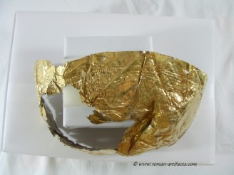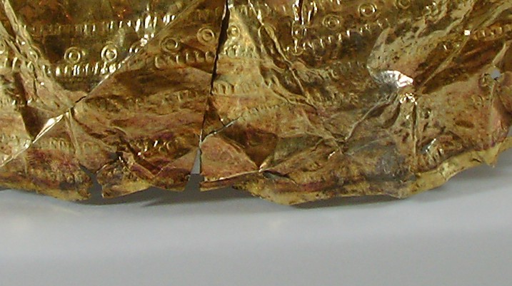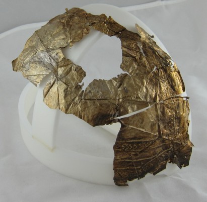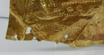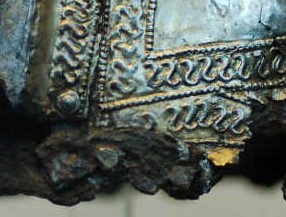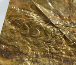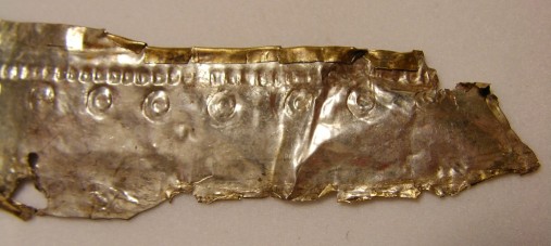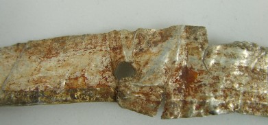 Small Fragment strip: The last discernable fragment consists of a small strip approximately 60mm long. This gold gilded fragment is quite thick, when compared to the other fragments. This could simply mean that the fragment was once part of a larger piece (likely) which obviously due to the hand made nature of its manufacture, was not uniform in thickness throughout. One of the interesting features on this fragment is the large amount of iron residue which is present on the reverse (silver side). This item clearly had transferred some of the iron surface of the helmet to the cover at one point during its life.