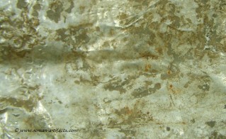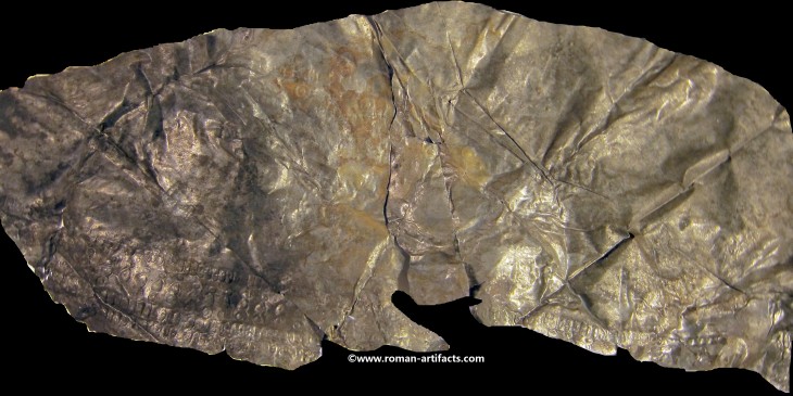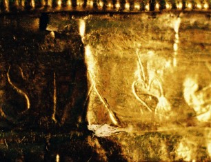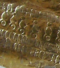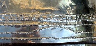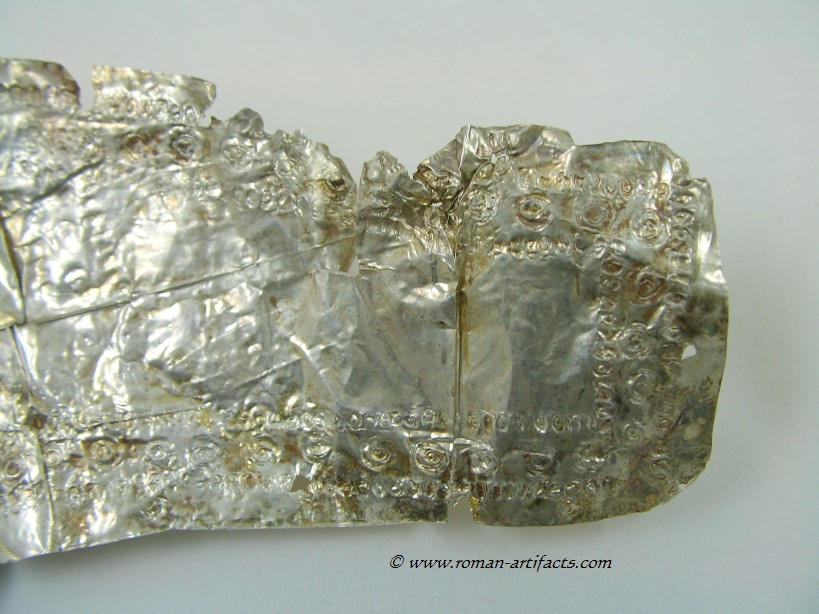 Inscription: As was common with many Roman military pieces, they were inscribed by their owners. This serves today to assist in identifying the owner, and possibly the unit in which the soldier served. This main helmet is no different. Luckily it also has a clearly inscribed area near the back of the helmet. This inscription was "dot punched" by making small circular indents to form letters. This is properly referred to as Punctim. The punctim was put into the silver gilding by the owner in a writing known as cursive script. Cursive script was the normal form writing in the Roman world, and looked much like hand writing today. It is however much harder to read, and as with hand writing styles today, can include many different forms of letters. The writing differed depending on the region of the empire, the level of literacy of the writer, and the period. Hand writing evolved like it has during modern history. The inscription was put in between the second to last line pattern and third to last line pattern at the base of the helmet and is approximately 70mm in length. The following is a photo, although it is difficult to make out due to the creases and reflectivity of the metal.