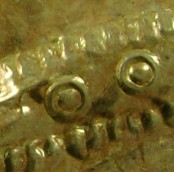 The Ivy leaf is commonly used through out Roman history, mainly as a decorative addition to jewelry and military items. Many military fitting (Horse Cavalry tackle as an example) contained Ivy Leaf shaping decorations. In classical mythology the ivy is attributed to the gods Apollo and Bacchus as a symbol of life. In early Christian symbolism it was also a sign for eternal life. That's the reason why it is used further on as a decoration on Christian tombstones and planted on graves. (5) Clearly the owner of this helmet wanted to add a symbol for eternal life. In this tumultuous period, that perhaps sadly did not occur for this owner. Decoration: The decoration consists of a circular "punched" pattern surrounded by a smaller bordering line. This line pattern creates a border to the helmet, covering the bottom portion, as well as running around the nasal section at the front and up over the top of the helmet. Within this pattern is a running circular "punched" pattern that continues around the helmet. This pattern is nearly identical to the one on the cheek piece and neck guard. The pattern running along the base of the helmet consists of 4 parallel lines, followed by the circular "punched" pattern and then a final line. As detailed in the dimension section above, the line pattern is slightly wider at the back of the helmet, than at the front. This creates a slightly sweeping appearance to the decoration along the side of the helmet. The side pattern meets the curved line trim around where the separate nasal section would have been riveted to the helmet. The final pattern then continues up over top of the helmet, leaving enough room for the attachment of the ridge section, which would have had its own covering and decoration (possibly gold or silver raised rivets). Decoration close up: