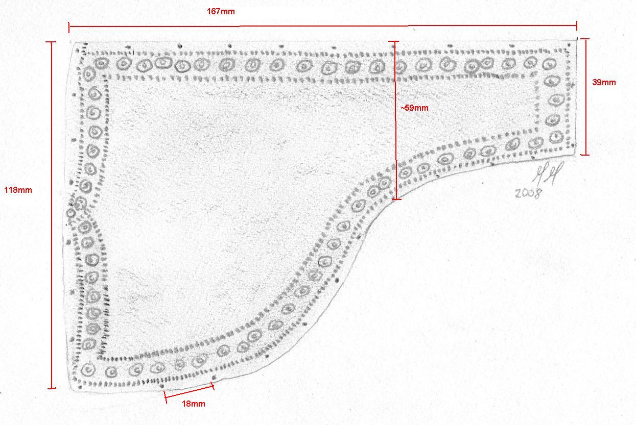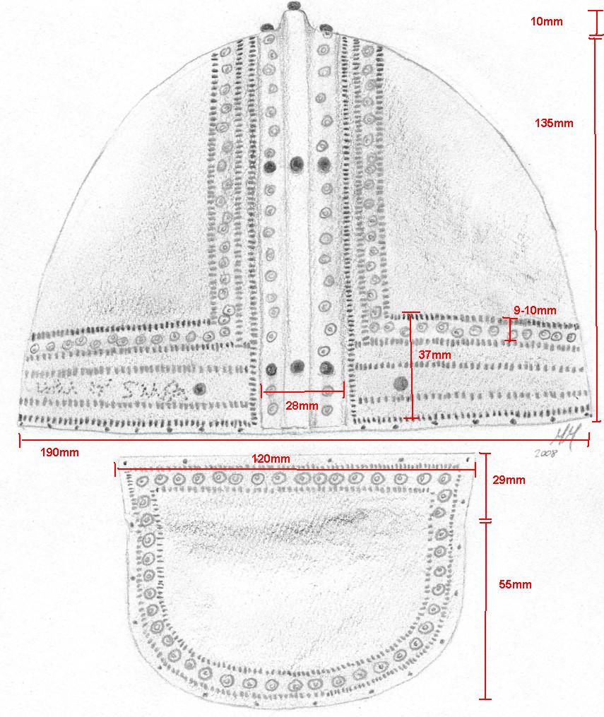Notice the similarity in pattern style when compared to the Augsburg helmet example above. Curved Ear pattern The discovery of a clear curved pattern in the decoration where the "ear" would normally be was only recently discovered (after the sketches were made). This decoration matches open examples of these helmets such as the ones from Koblenz and Heteny in which the ear section is cut out.
