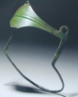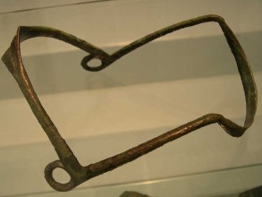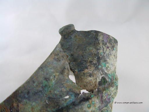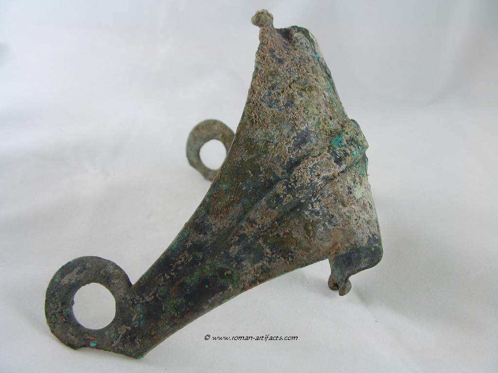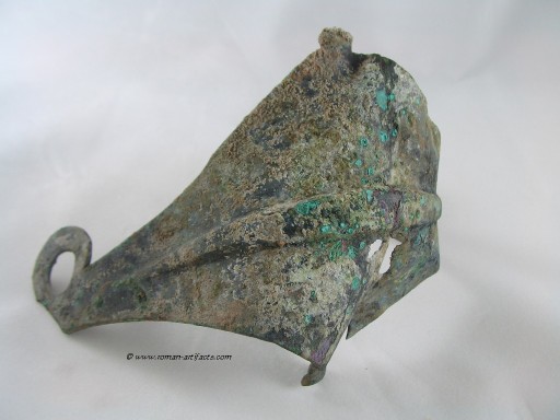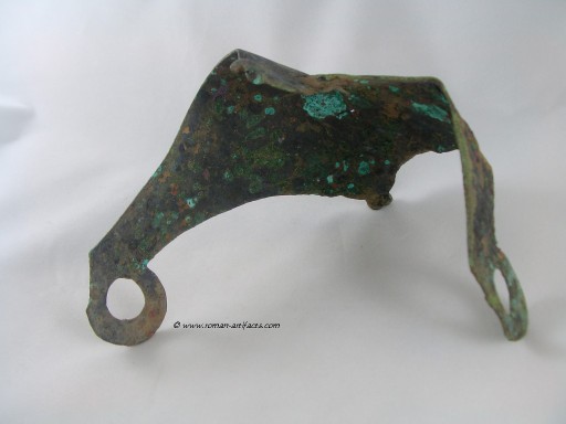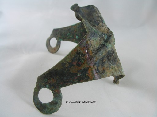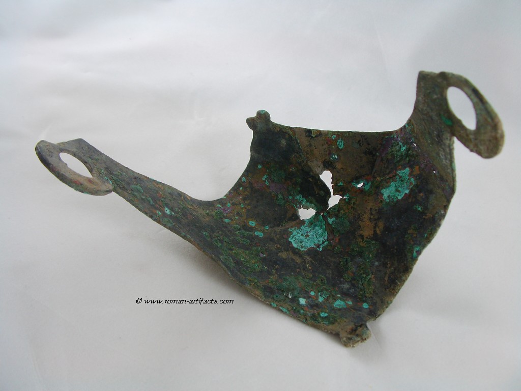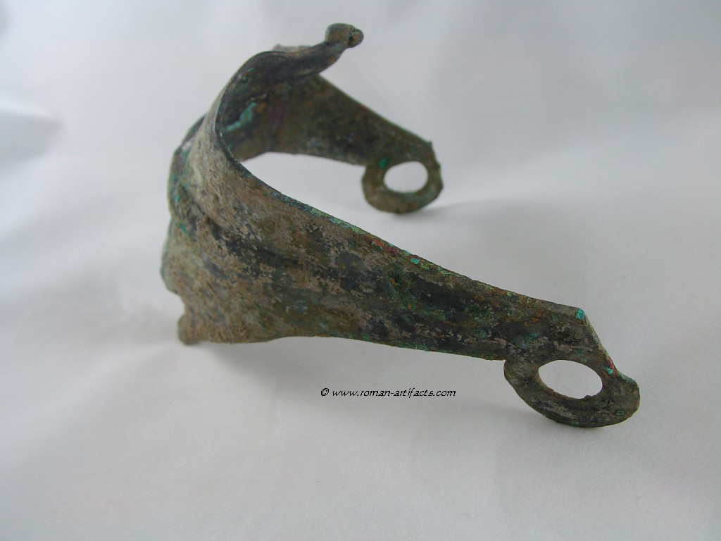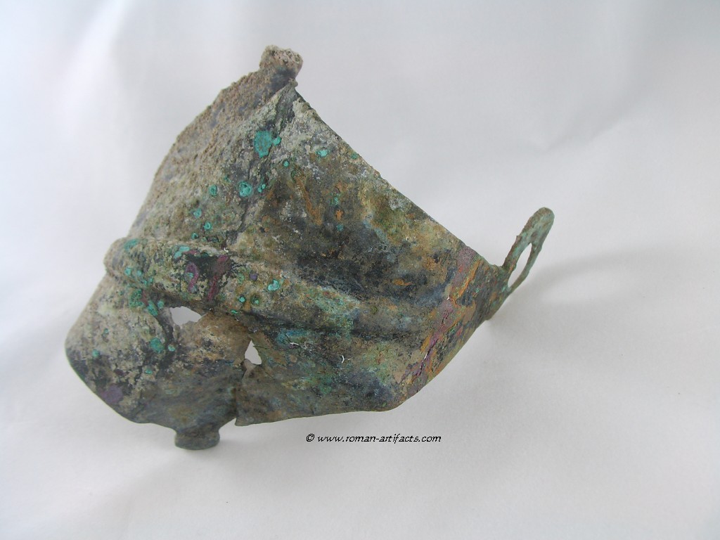 A bronze Roman Cavalry Harness or Cavesson. A military harness or muzzle for the Cavalry Soldier's horse. This piece has two loops on each side to accept the actual horse bit, with a ridged lateral nose band around the center. At the center of the piece which would have sat on the bridge of the horses snout, two decorative circles extend in opposing fashion. A part of the center is cracked which appears to have happened in antiquity. (possibly from battle damage or at burial) Much of the surface is still covered in a rough patina, and areas with surface encrustations are still visible. (item will be properly conserved) The original piece would most likely have had a narrow rod that would have joined the two hoops under the snout of the horse. This would have provided support for the Cavesson on the horses head. The Harness or Cavesson was more common in the East/Mediterranean however numerous examples exist from the Western provinces. Something that was derived from a mixture of Italian and Barbarian elements, and most likely was influenced from the orient. (Thracian) This item would have provided tighter control of the horse and would have allowed for better Cavalry tactics and battle manoeuvres.(1) Rare example for which there are not many that have survived. This may in part be to their limited use. Some similar museum examples from the Nijmegen Museum. (photo from www.romancoins.info )