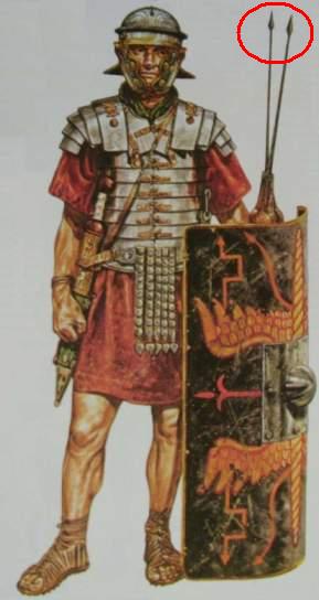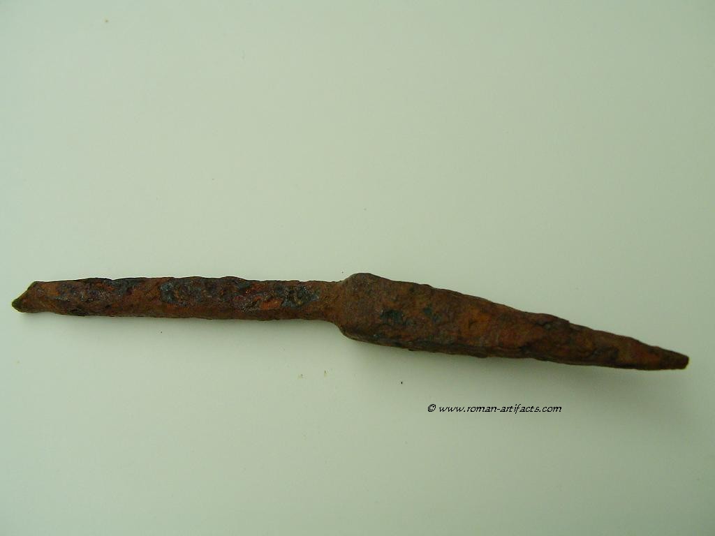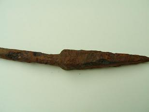 Iron arrowhead or Pilum end piece. A square shaped tapering to a point with a slight bend in it. A shaft or iron leaves the point and end abruptly. This could have been an arrow head designed for penetrating Chain mail armor as the shape indicates. The size and the thickness of the shaft however make me think that it could be the end piece to a Roman Legionary Pilum, which would have had a similar type of point. The Pilum was the weapon of the Legionary next to his Gladius, and essentially was a thin shaft with a pointed end. A wooden shaft was also then attached to the iron shaft creating a long spear length weapon. Sometime a weighted piece was added between the iron shaft and the wood. The theory was that the Pilum could be thrown, impacting the enemy and bending. This meant that the Pilum could not then be thrown back at the Legions. It was not until the later 3rd- 4th Century that these were no longer used. It is also possible that this "arrow" was also used as a balista(crossbow type device) bolt/tip. This would most likely have been larger than a regular arrow and used to penetrate numerous enemy soldiers. It also is possible that it belongs to a later period. **any help in finding sources for this item would be appreciated, as I have none**